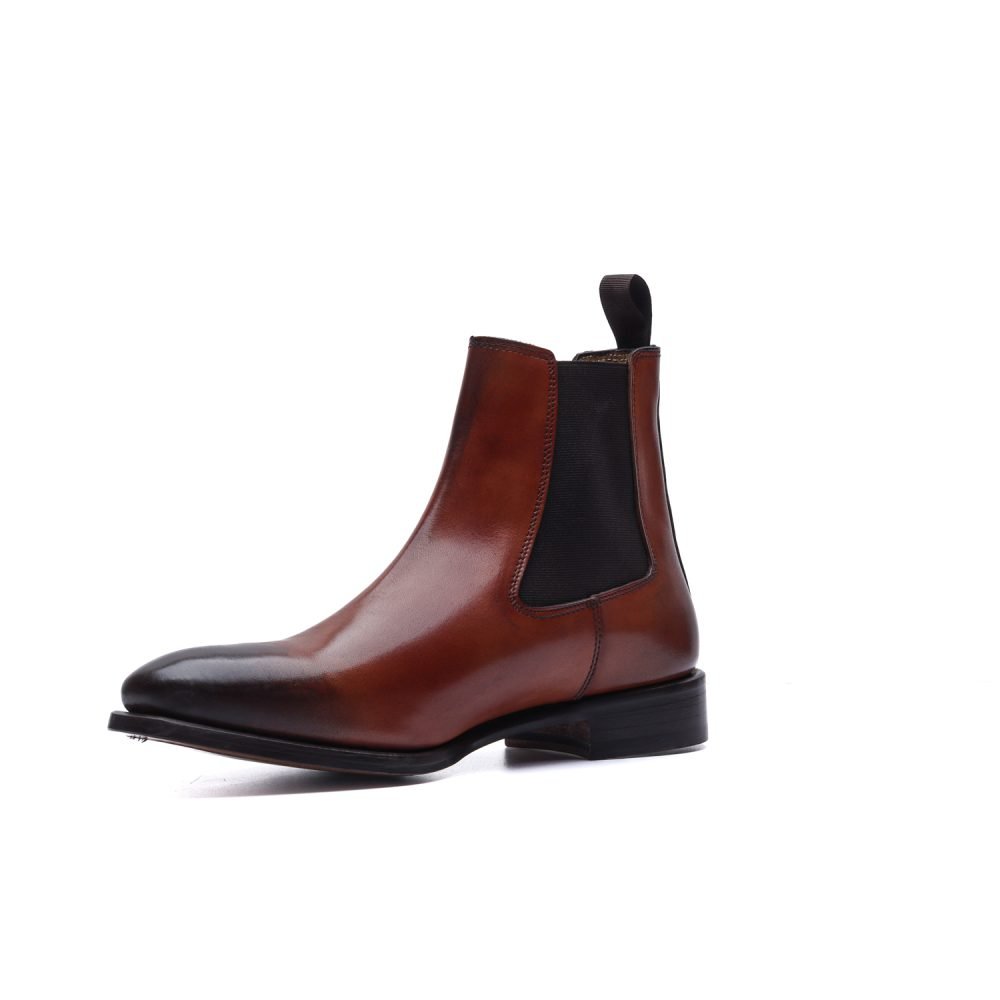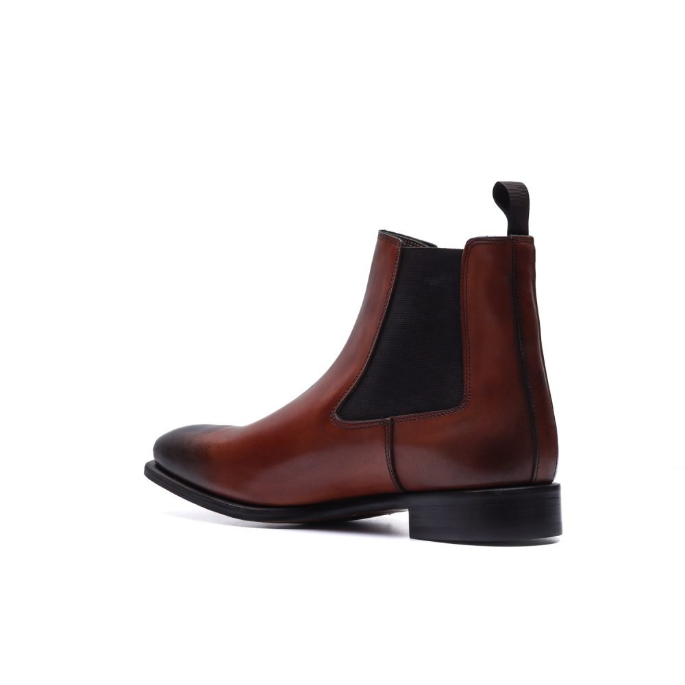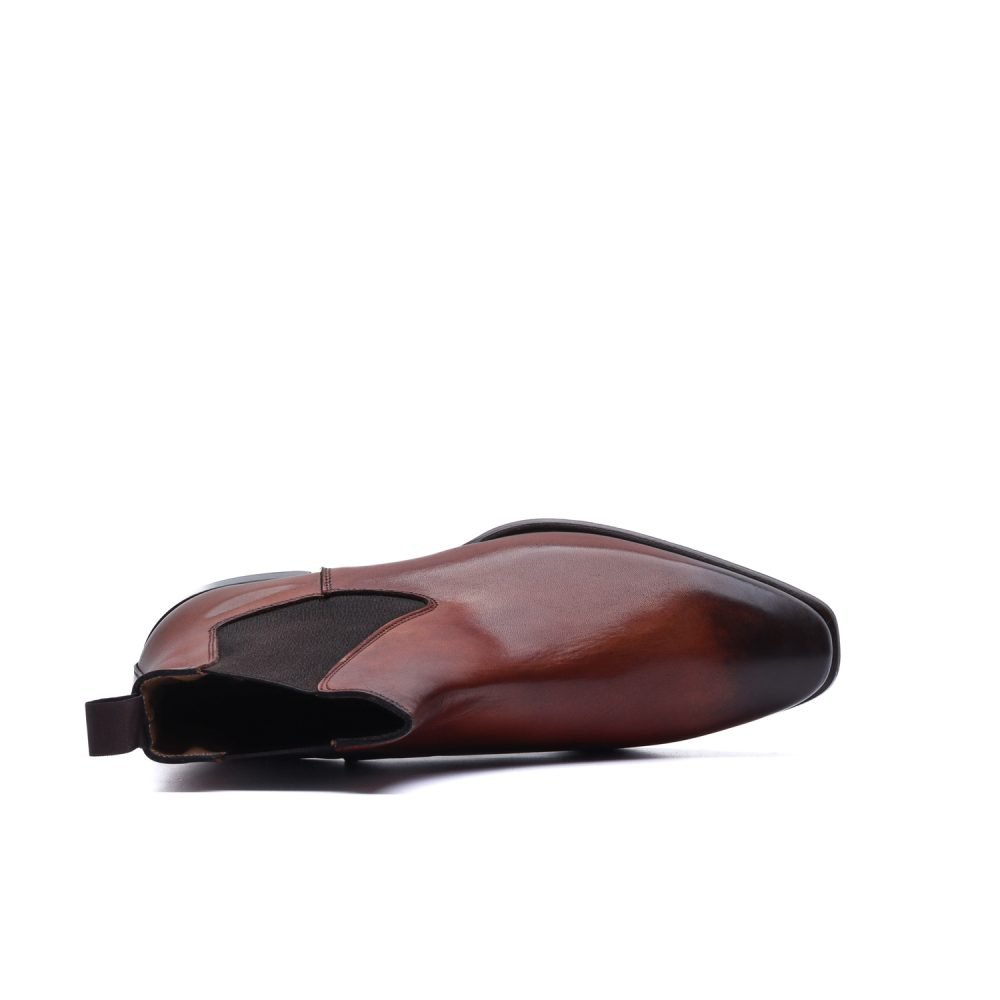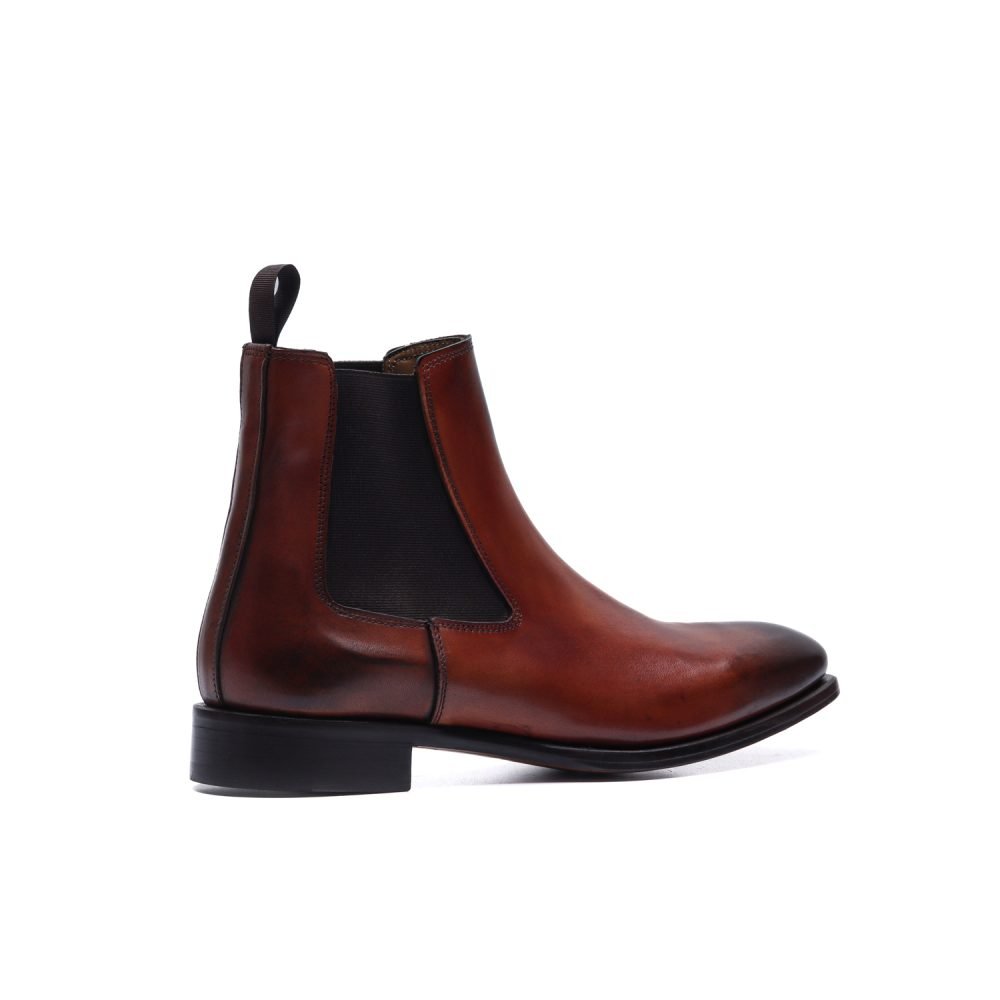 Chelsea boot realizzato artigianalmente in Italia in pelle crust brandy tinta a mano. La tomaia liscia e pulita, priva di cuciture visibili sul collo del piede, ne esalta la sobrietà formale, mentre gli elastici laterali, sapientemente incassati, garantiscono una calzata comoda e avvolgente.