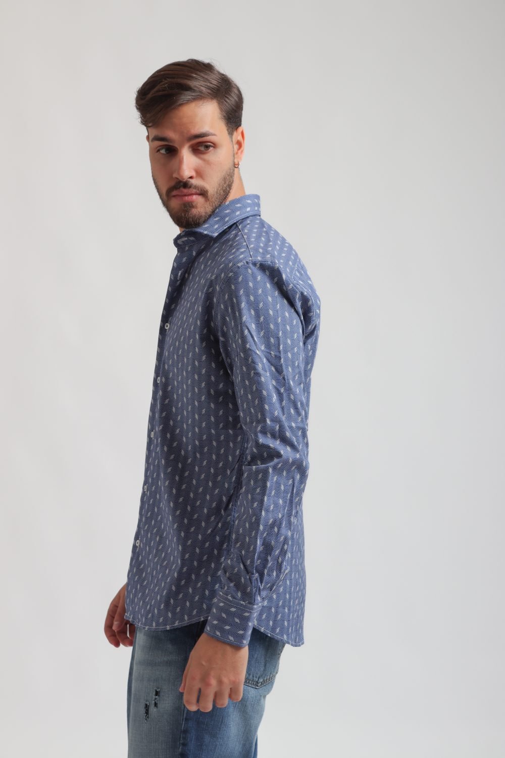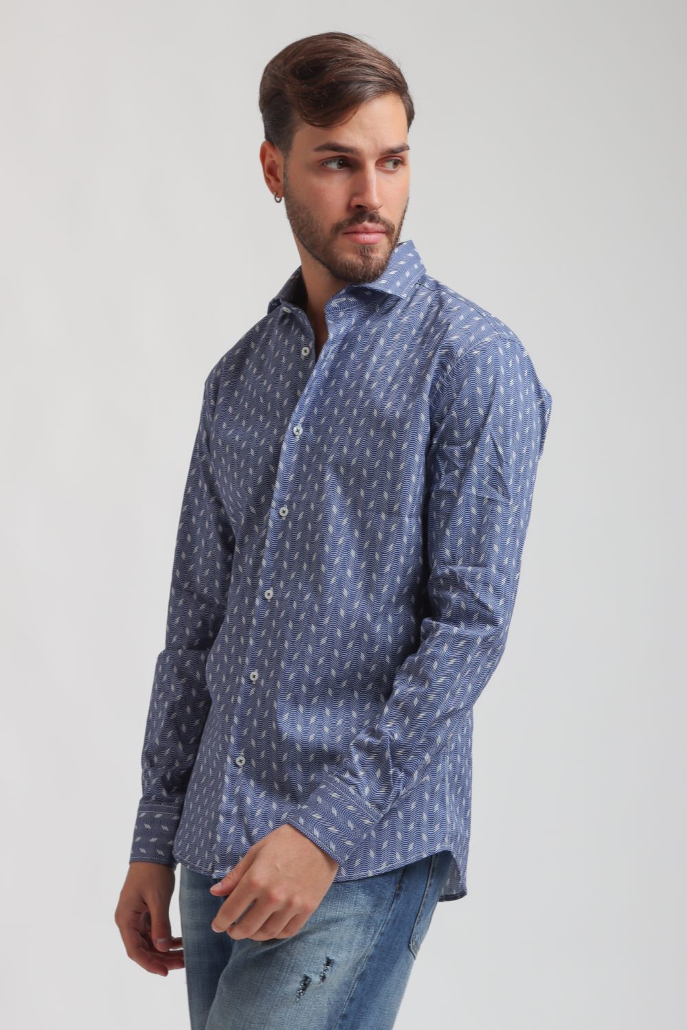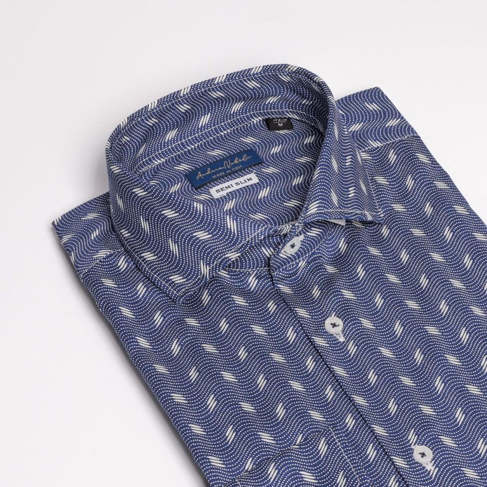 Camicia Made in Italy, resa particolare dalla fantasia nel colore bianco su base azzurra, collo alla francese con polsini con angoli squadrati e due bottoni.