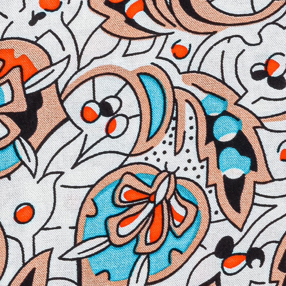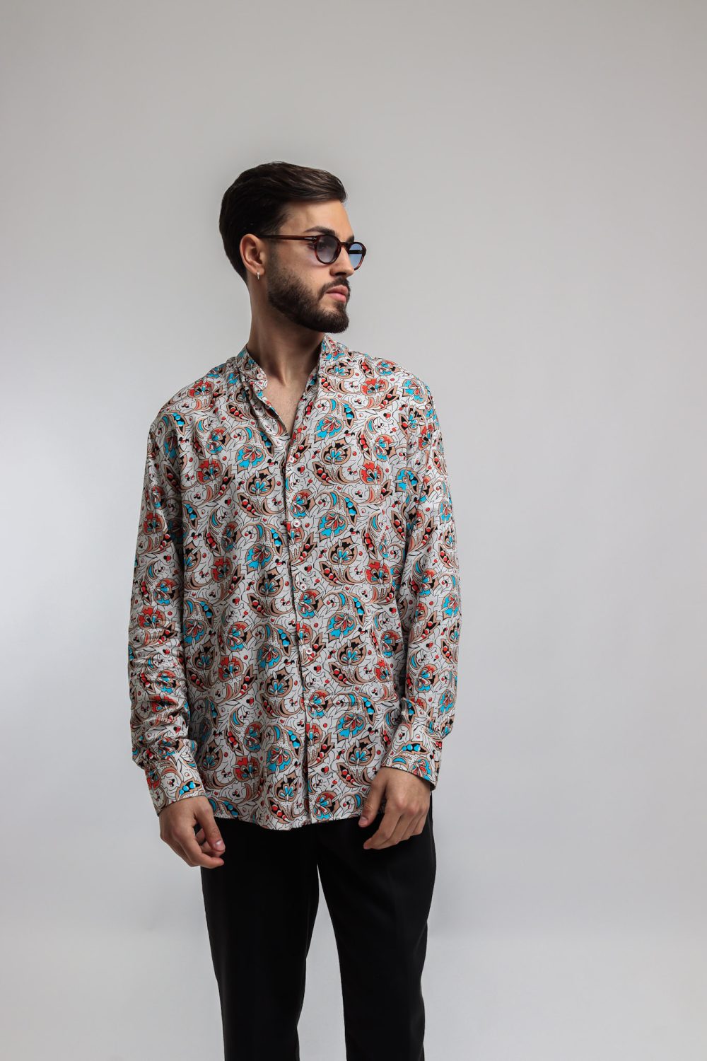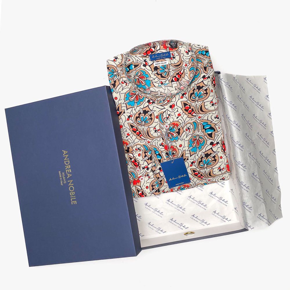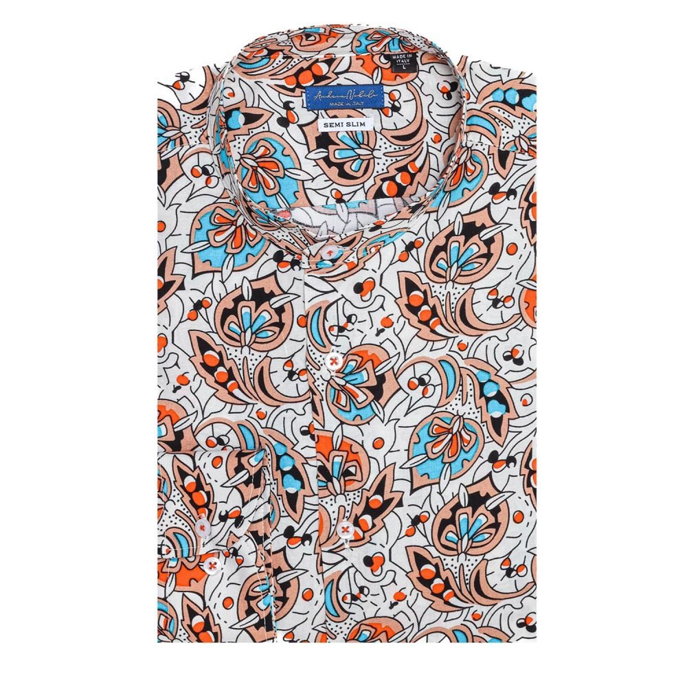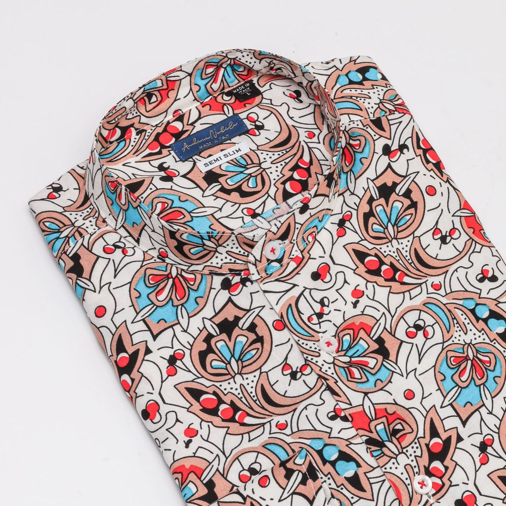 Camicia made in Italy, resa particolare dalla fantasia nel colore azzurro, rosso,nero e arancio su base bianca, collo alla koreana con polsini con angoli arrotondati e due bottoni