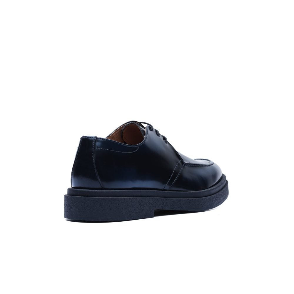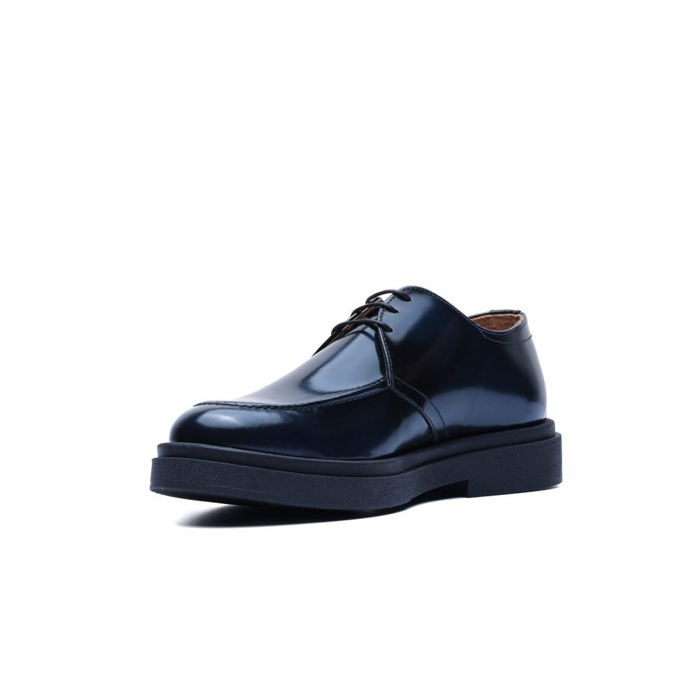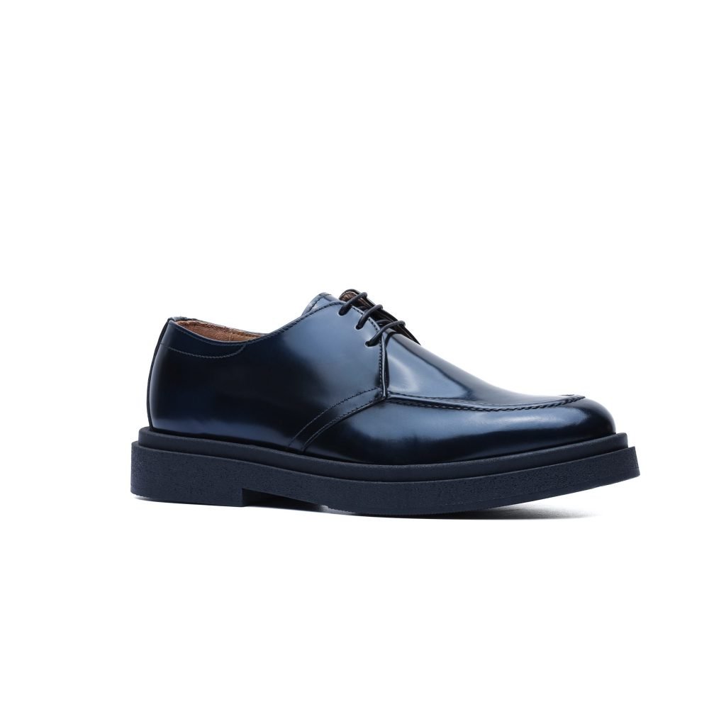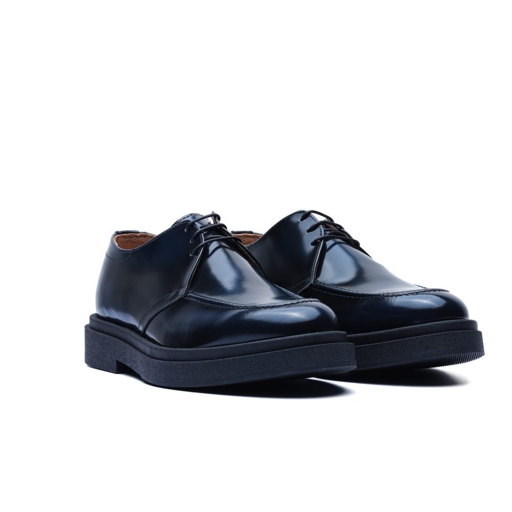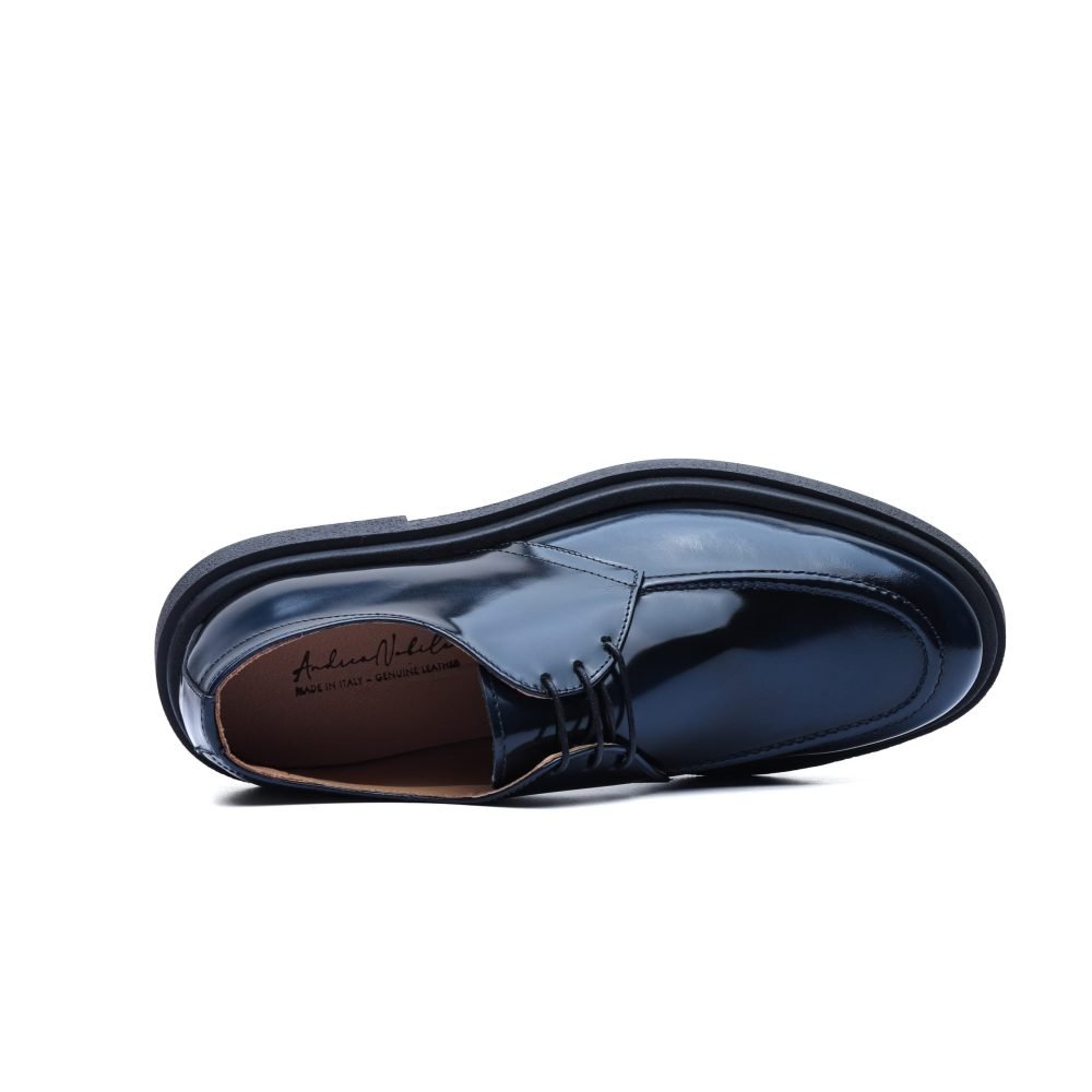 Realizzata in pelle di vitello tinta a mano nel colore blu con lacci nel colore nero.