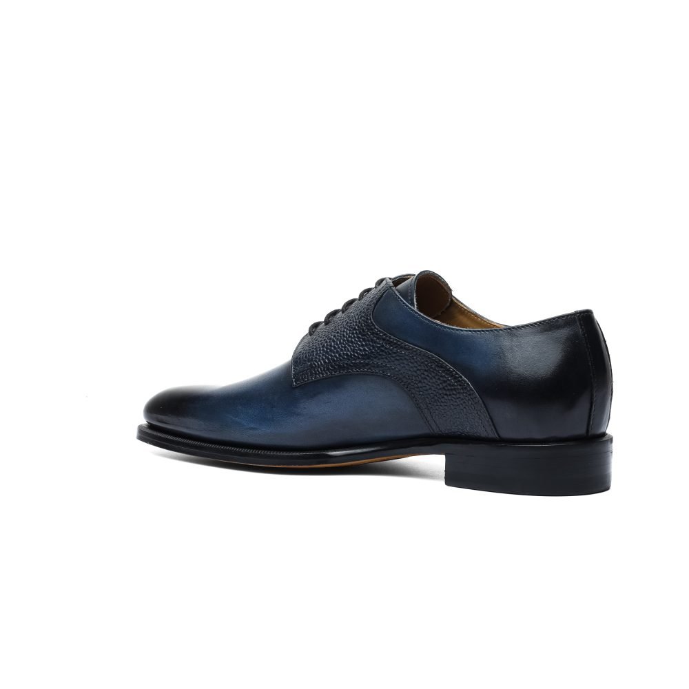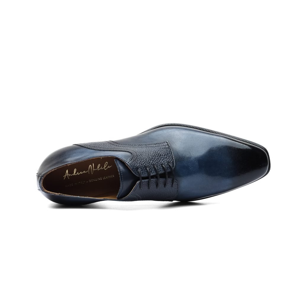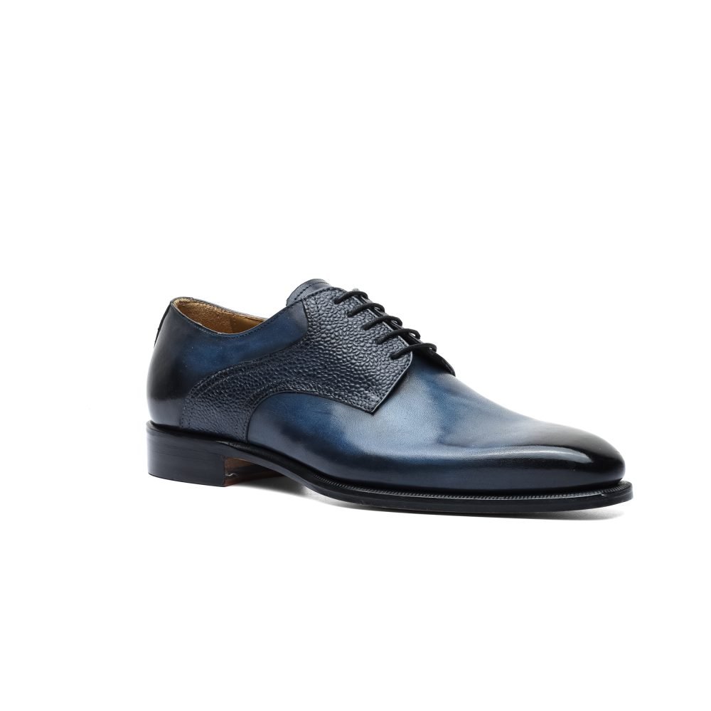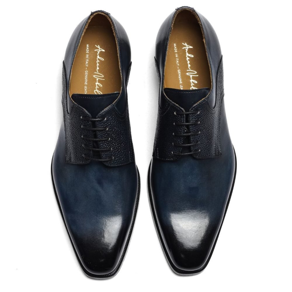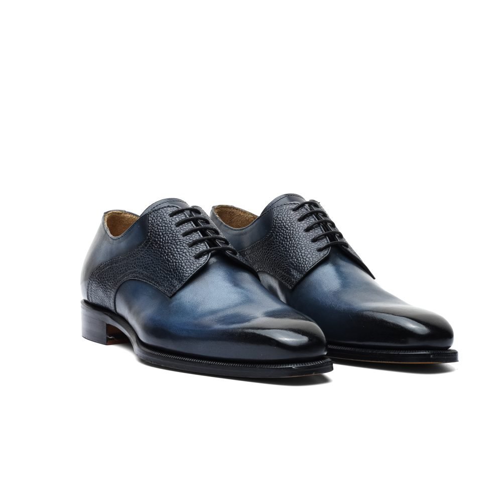 Calzature artigianali made in Italy modello Derby, caratterizzati dal dettaglio riportato sulla parte alta della tomaia