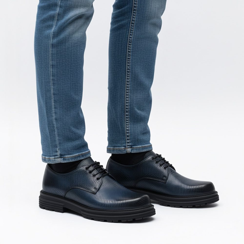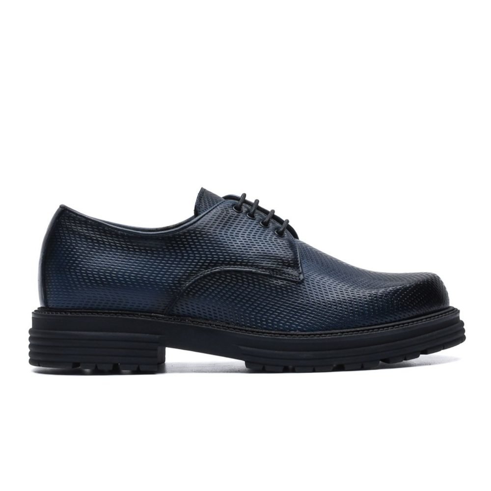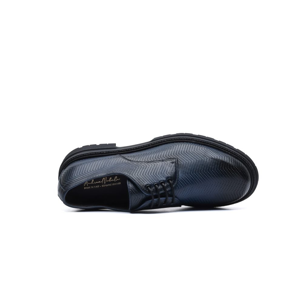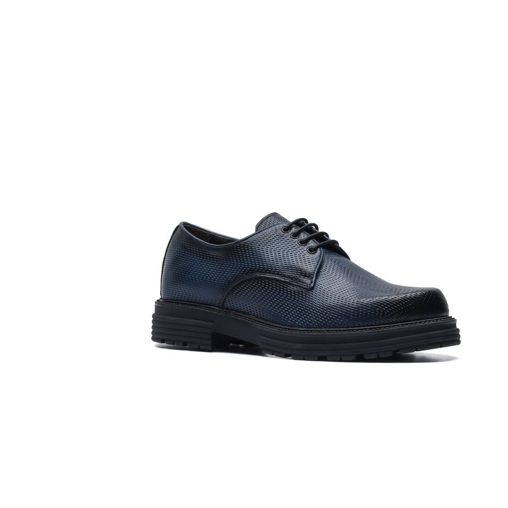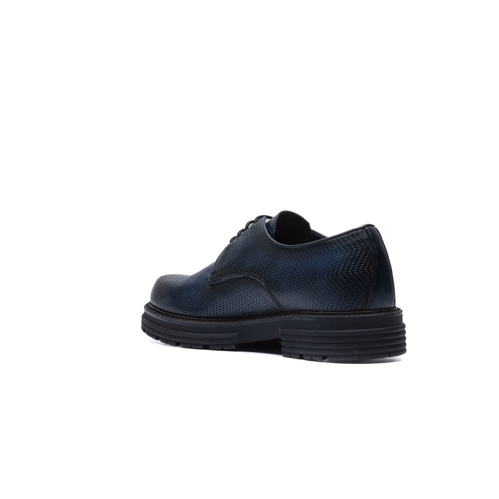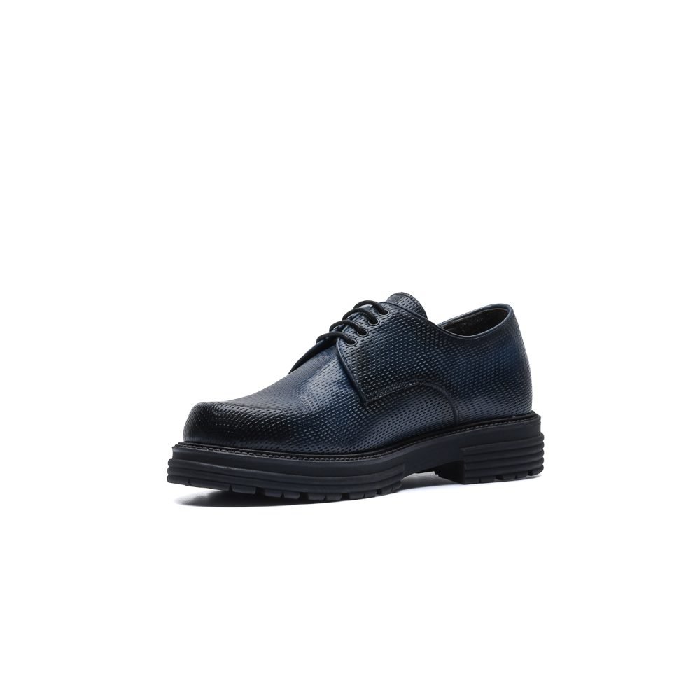 Derby in pelle di vitello stampata con texture ispirata all’accelerazione e tinta a mano con sfumature artigianali.