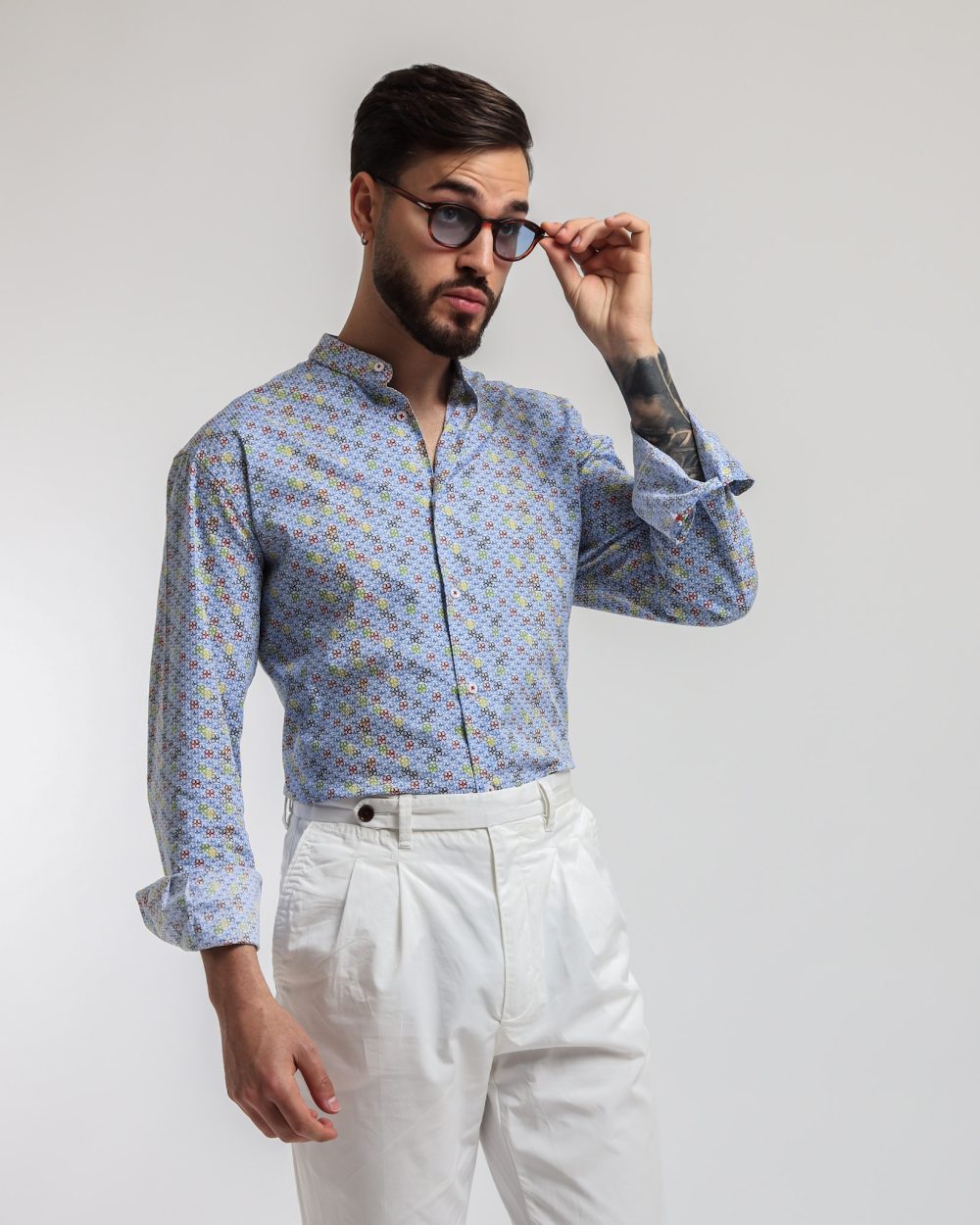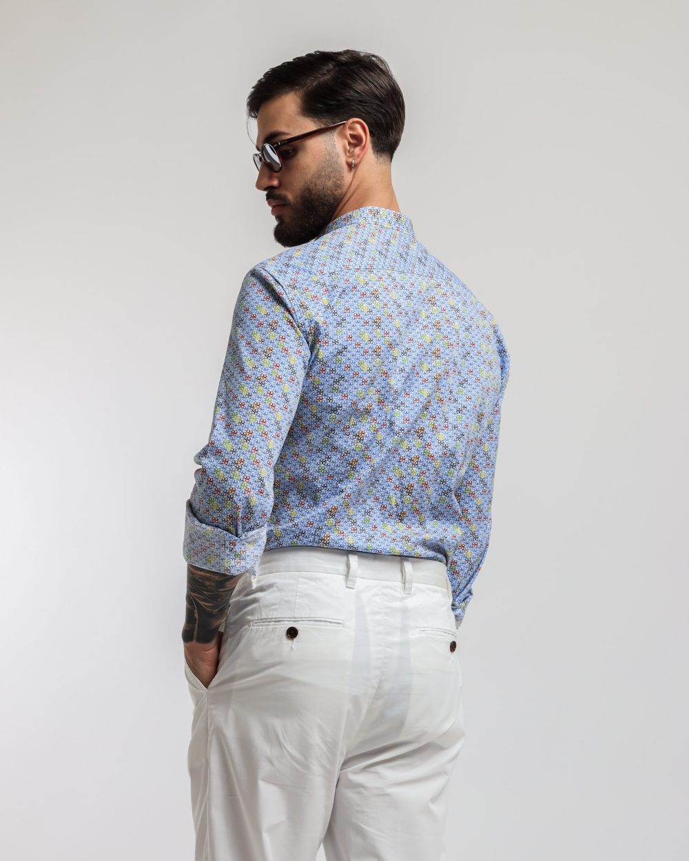 Camicia made in Italy, resa particolare dalla fantasia nel colore bianco su base azzurra, collo alla koreana con polsini con angoli arrotondati e due bottoni.