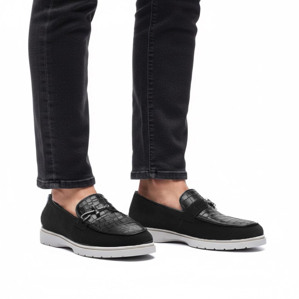 Realizzata in morbido camoscio nero con mascherina in pelle stampata effetto coccodrillo tono su tono, questa calzatura combina sapientemente gusto sartoriale e comfort contemporaneo.