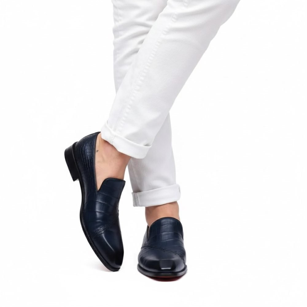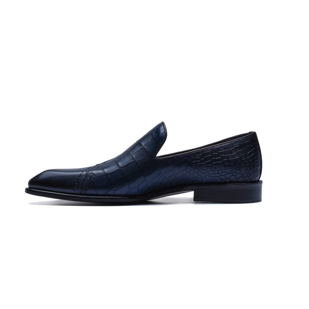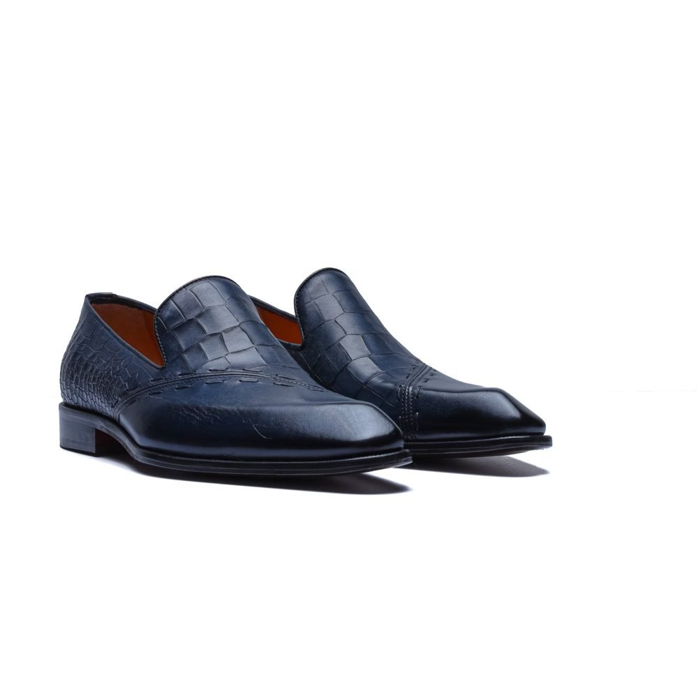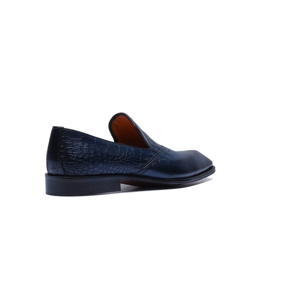 Realizzata in pelle di vitello mista a pelle di vitello stampa coccodrillo tinte a mano nel colore blu.