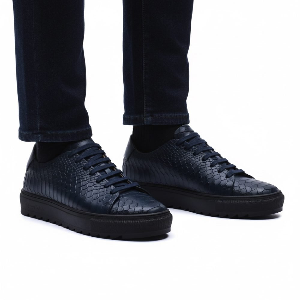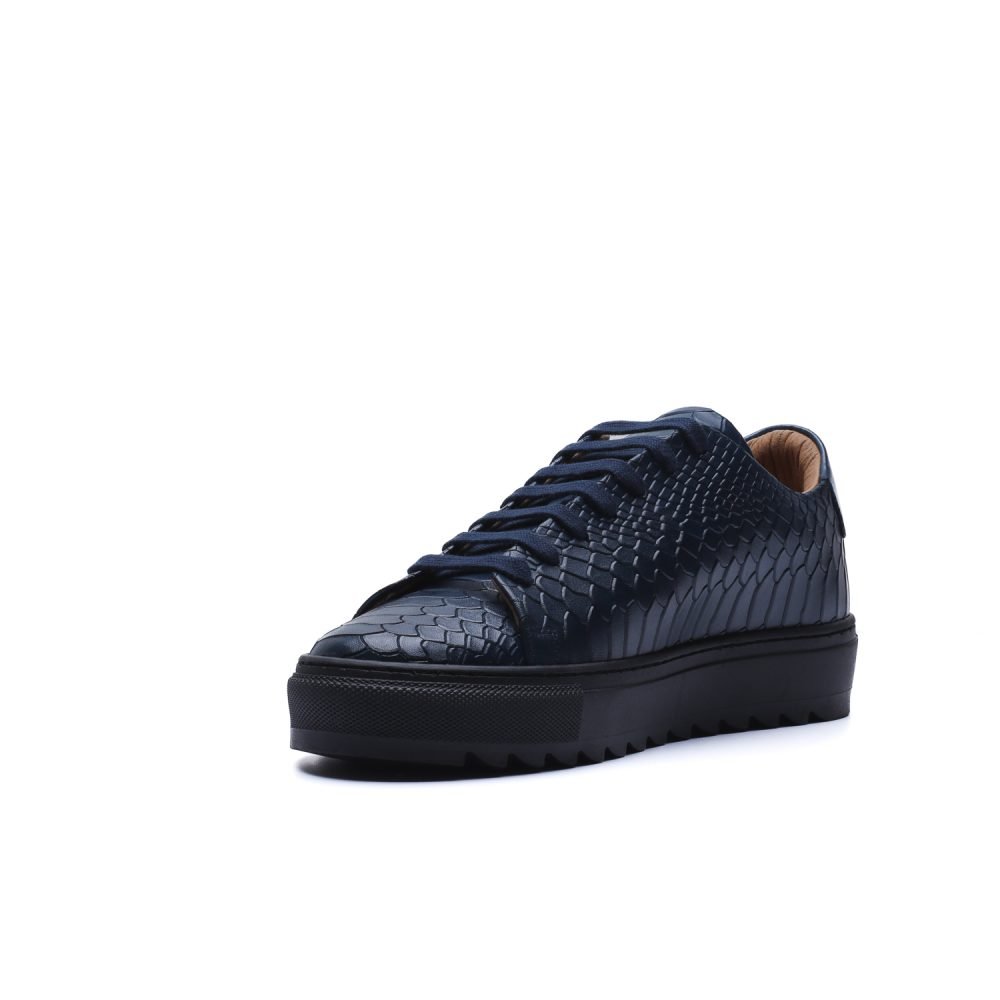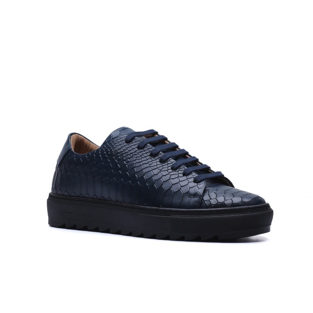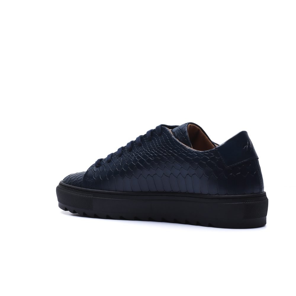 Sneaker Made in Italy realizzata in vera pelle tinta a mano nel colore blu con sfumature naturali, impreziosita da una tomaia in pelle con stampa anaconda che riflette la luce con eleganza, senza rinunciare a un’impronta urban.