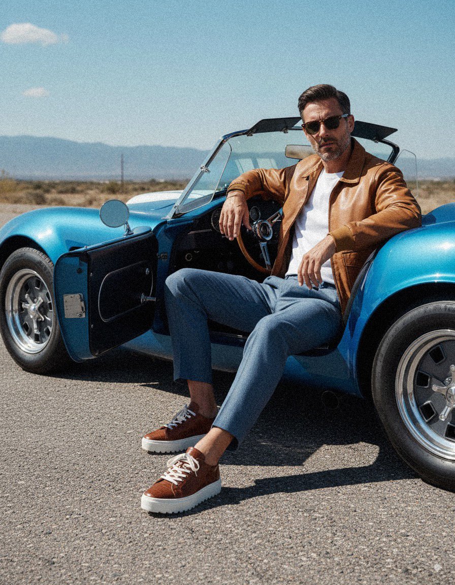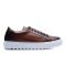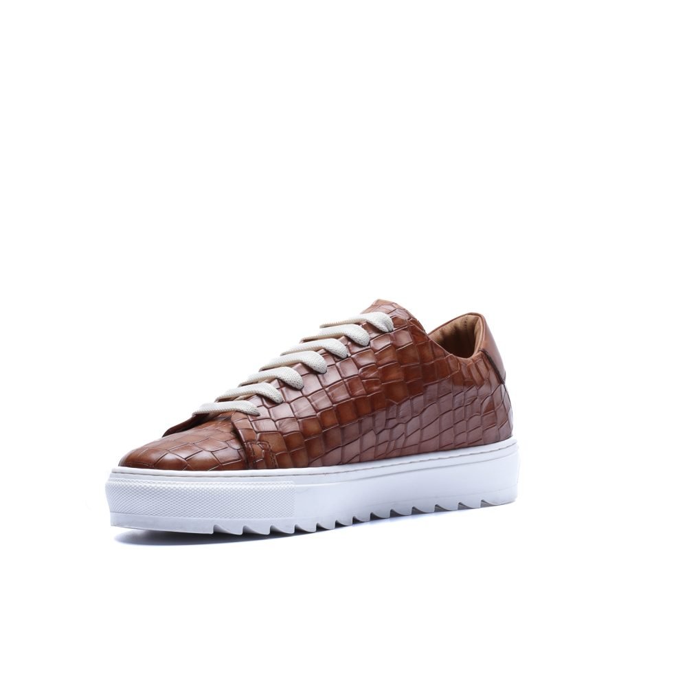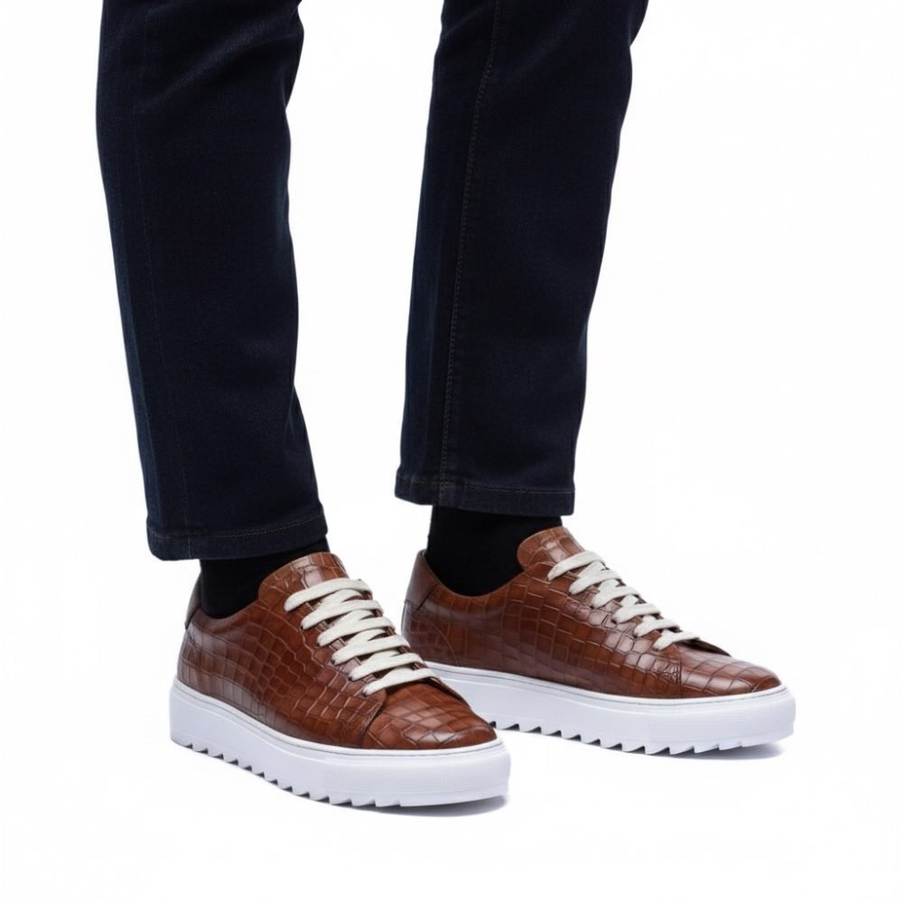 Sneaker Made in Italy realizzata in vera pelle siena tinta a mano con sfumature naturali, impreziosita da una tomaia in pelle con stampa coccodrillo lucida che riflette la luce con eleganza, senza rinunciare a un’impronta urban.