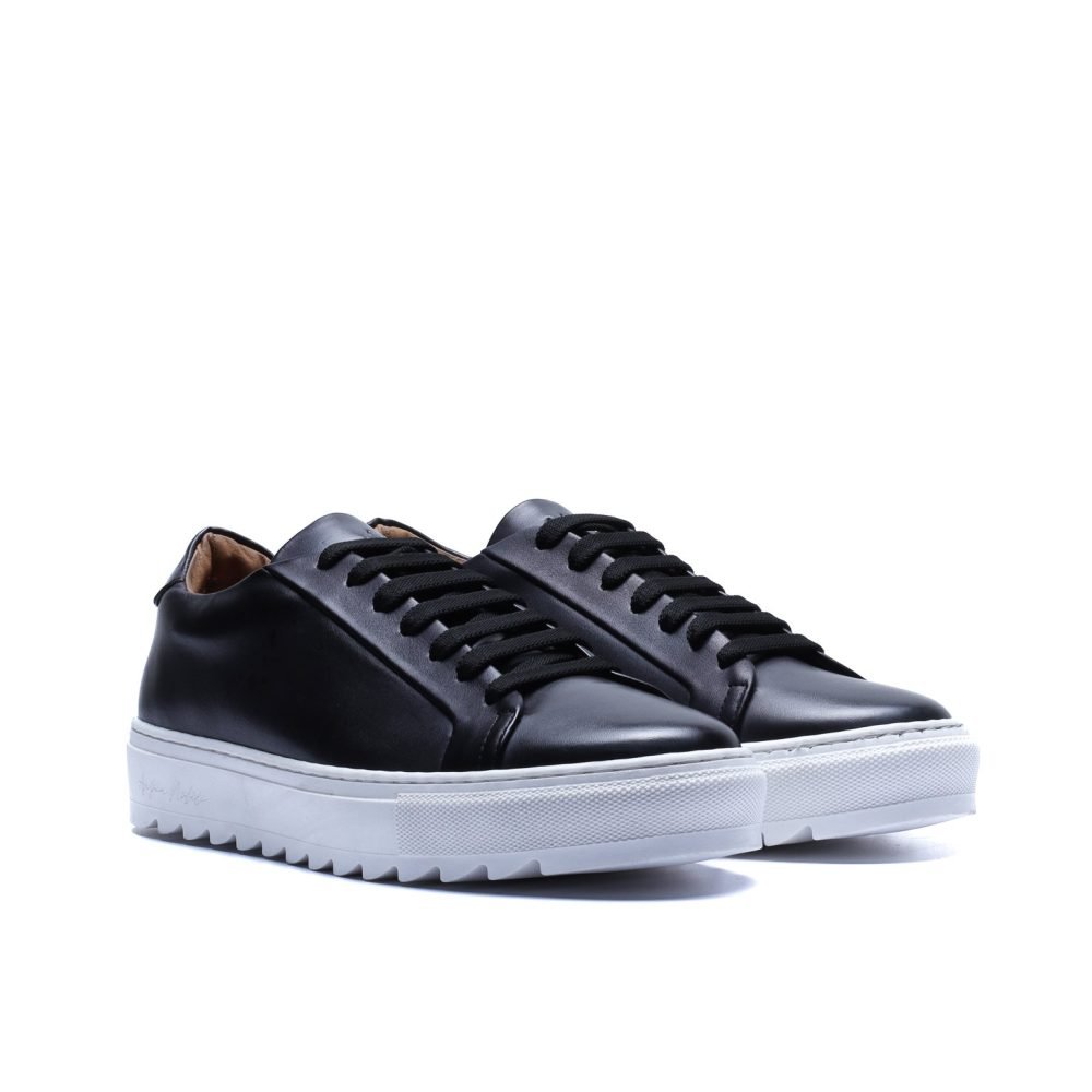 Sneaker Made in Italy realizzata in vera pelle nera tinta a mano con sfumature naturali, caratterizzata da una suola bianca con disegno “dente di squalo” che aggiunge dinamismo e personalità alla silhouette.