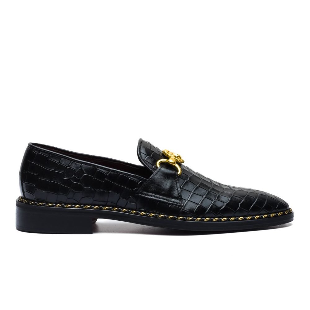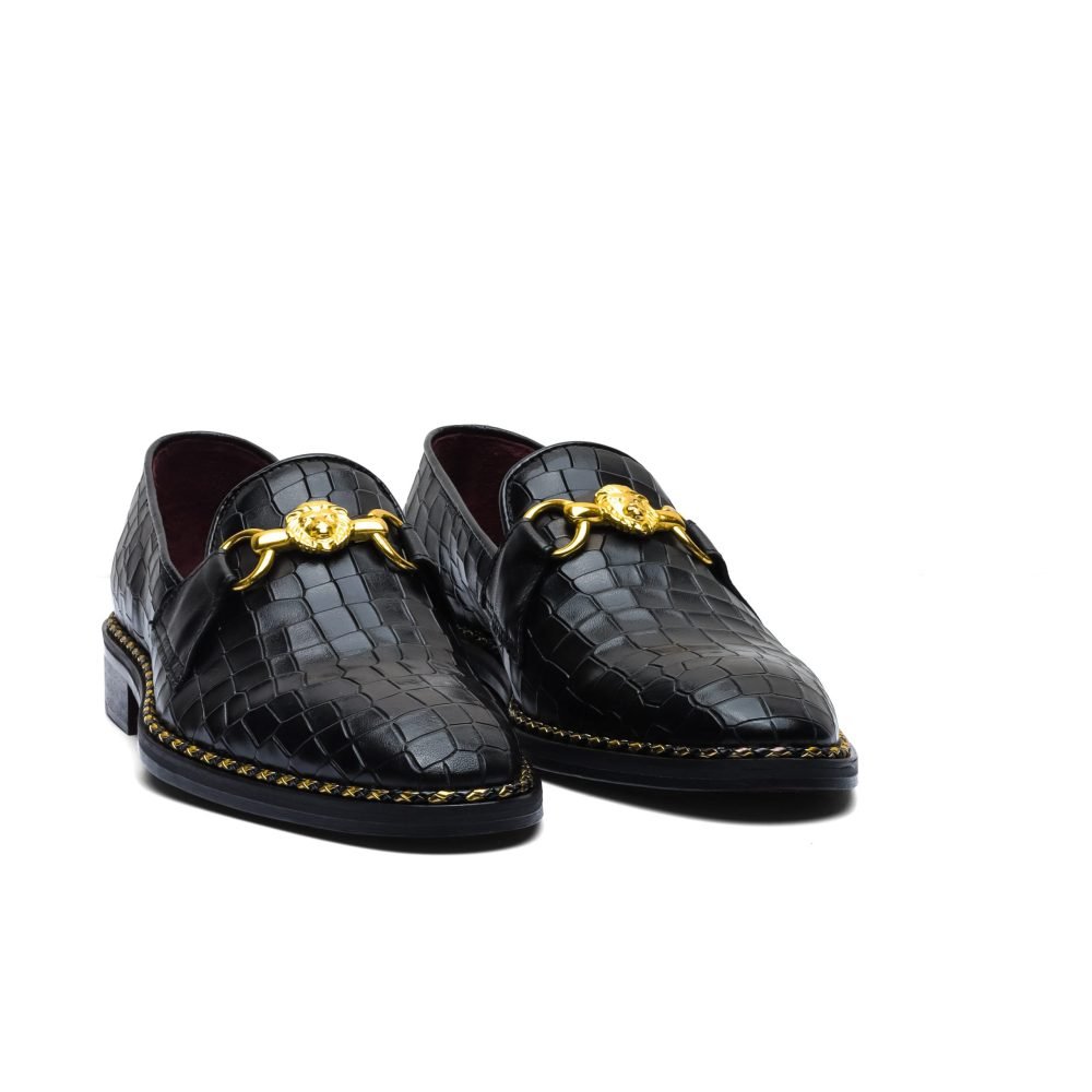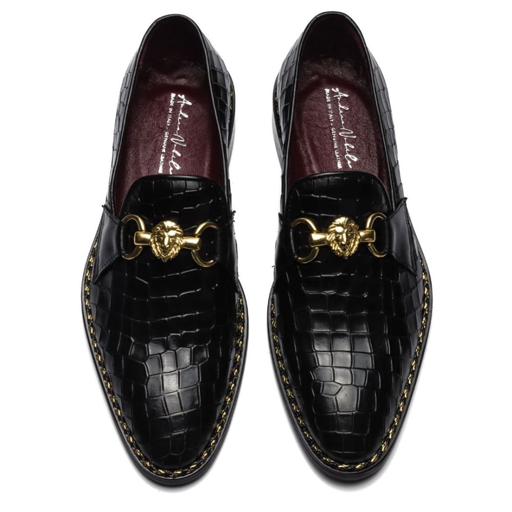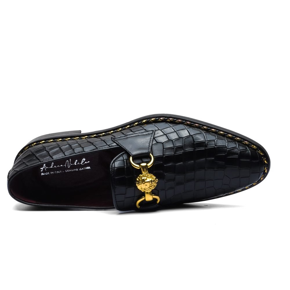 Calzature artigianali Made in Italy modello Mocassino, rese particolari dalla pelle con stampa coccodrillo.