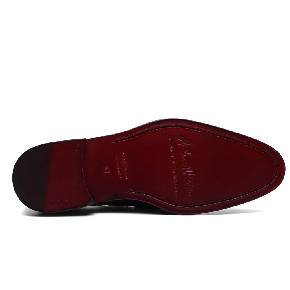 La suola è in cuoio lavorata a blake, tinta a mano nel colore bordeaux. Le cuciture perimetrali sono arricchite da un cordino intrecciato in pelle nel colore oro e nero.