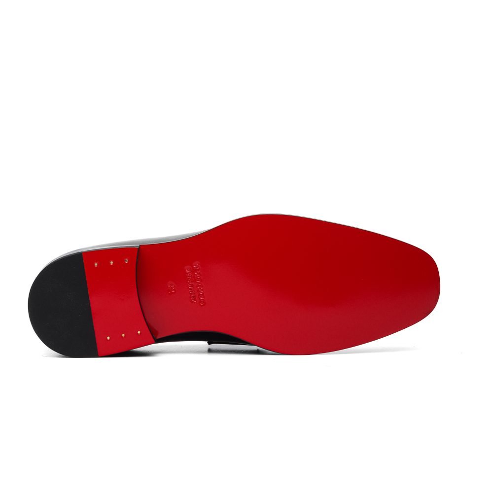 La suola è in cuoio lavorata a blake con increna, tinta nel colore rosso e trattata con un’esclusiva cera effetto specchio.