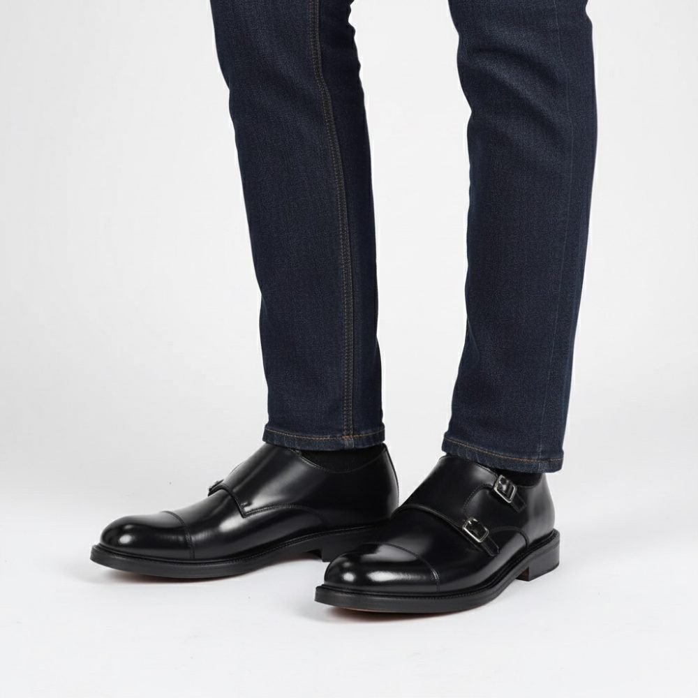 Realizzata in pelle di vitello tinta a mano nel colore nero, riporta la mascherina con doppia fibbia metallica