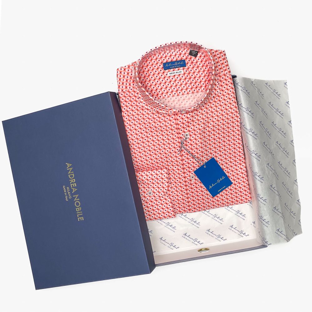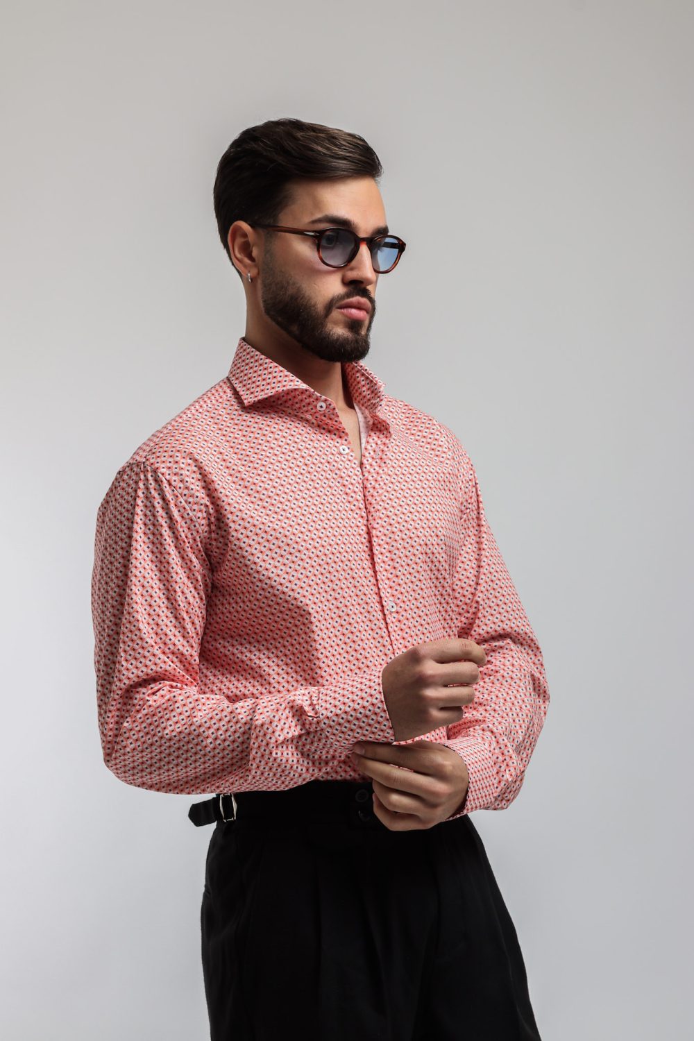 Camicia made in Italy, resa particolare dalla fantasia nel colore rosa e rosso su base arancio, collo alla francese con polsini con angoli arrotondati e un bottone.
