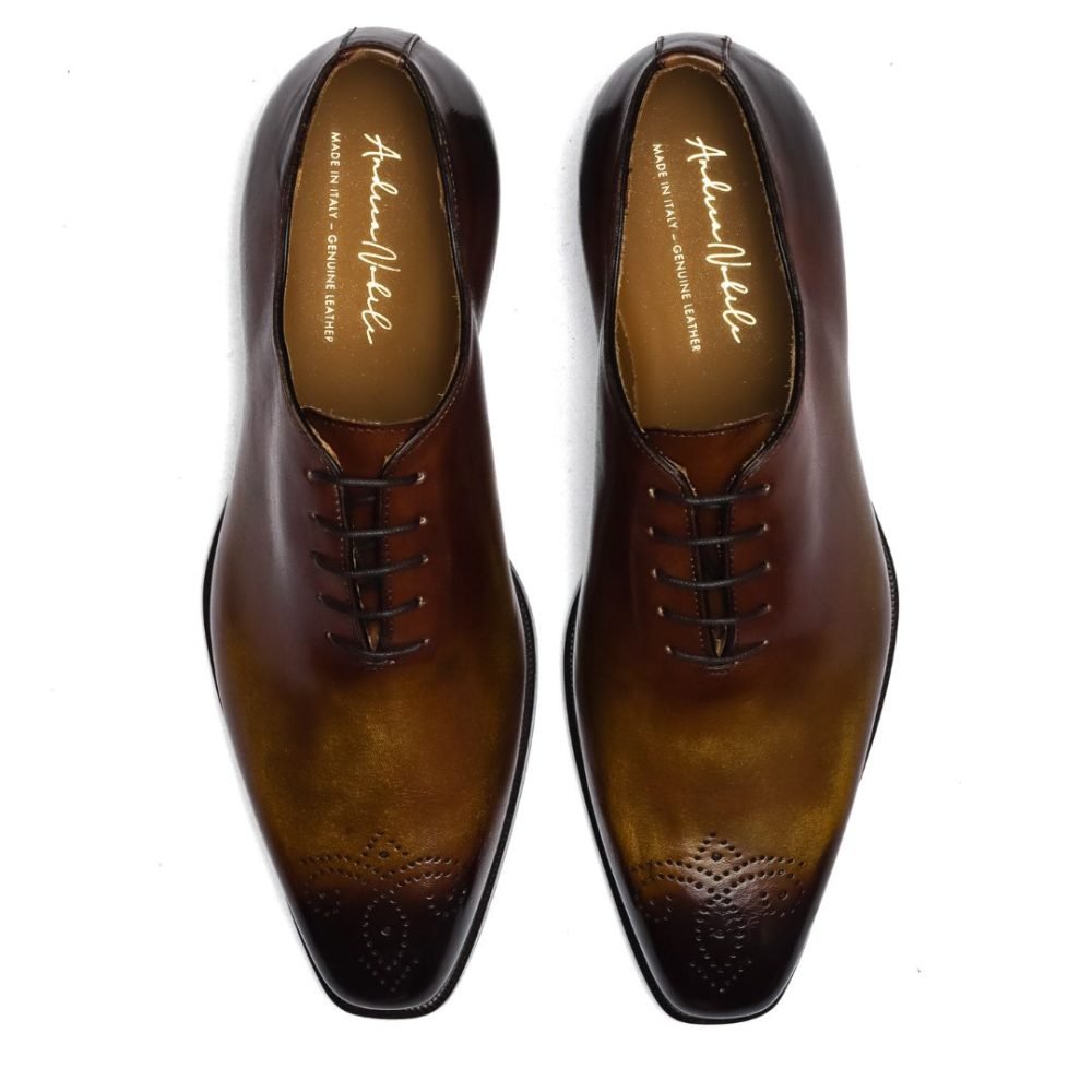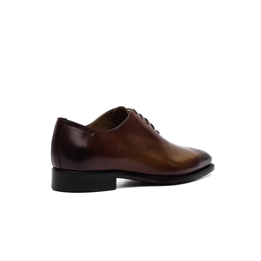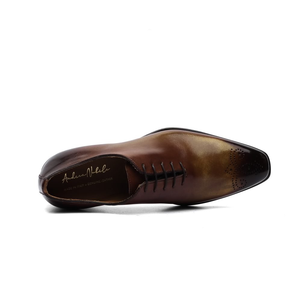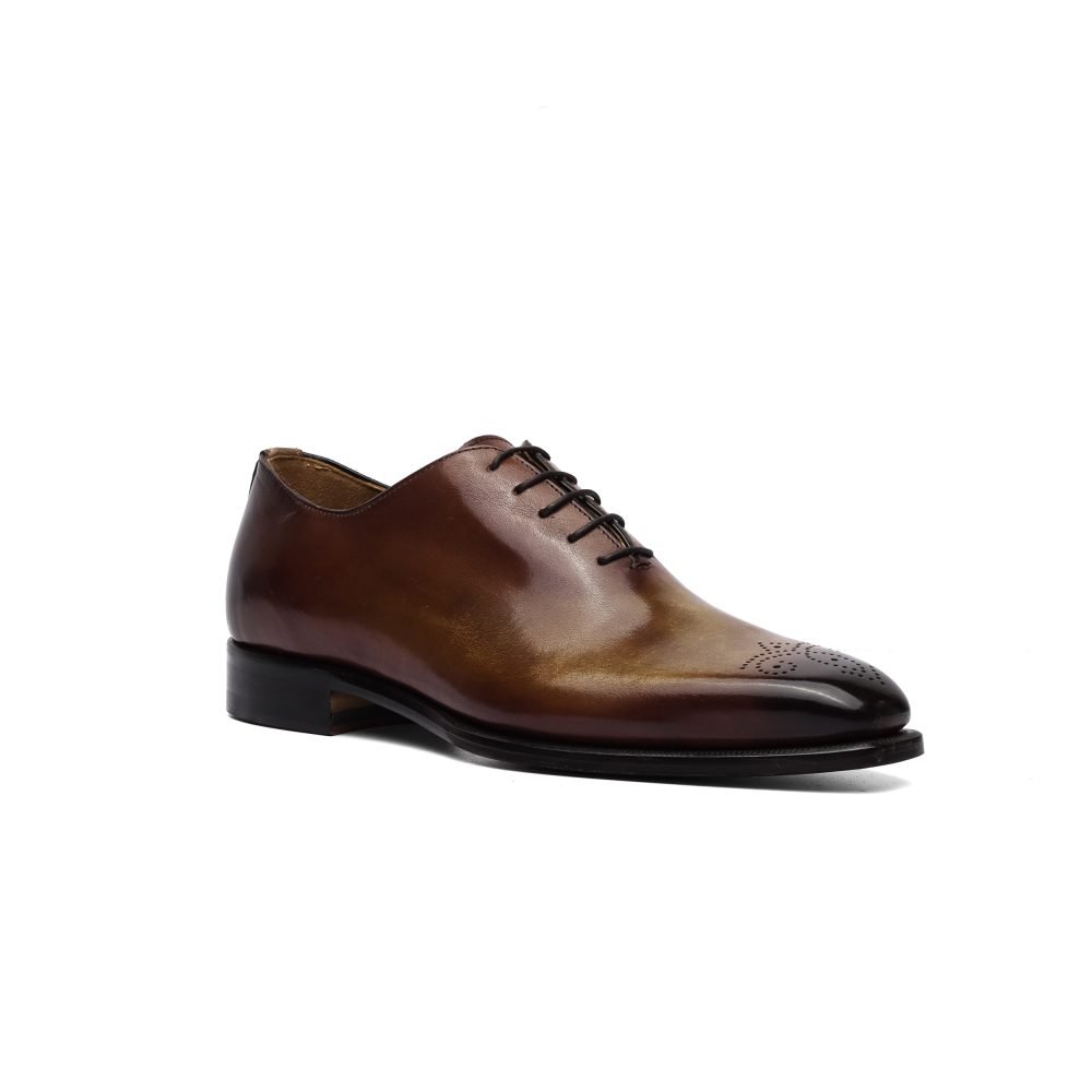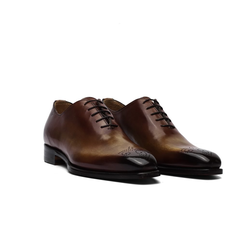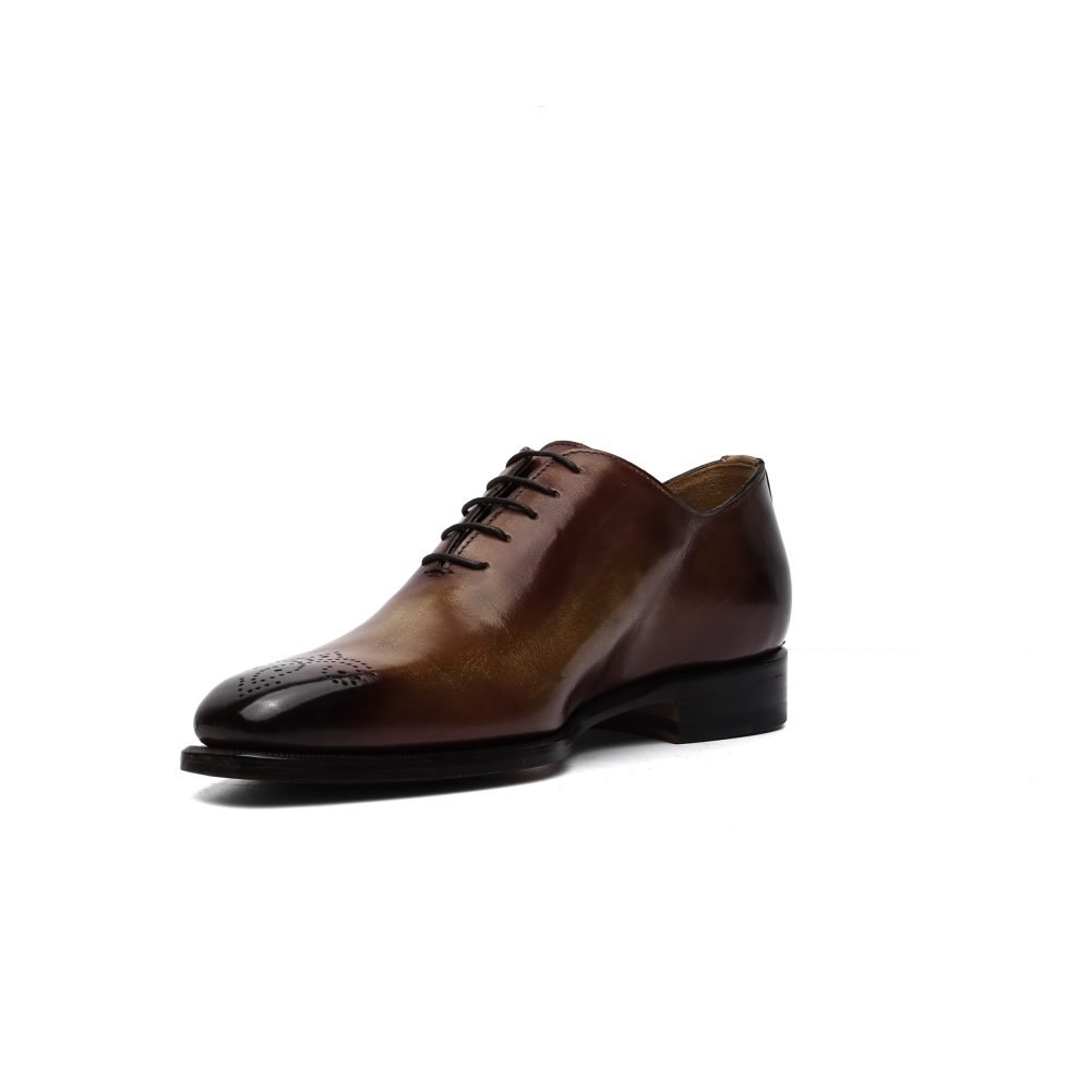 Calzature artigianali Made in Italy stringata modello Oxford, caratterizzata dal dettaglio brogue sulla punta.