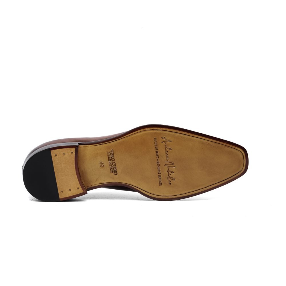Realizzate in pelle di vitello tinta a mano nel colore marrone con punta e tallone sfumati.