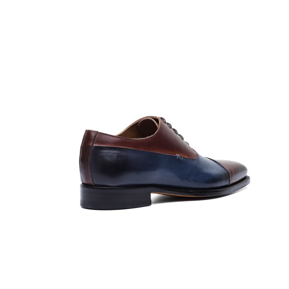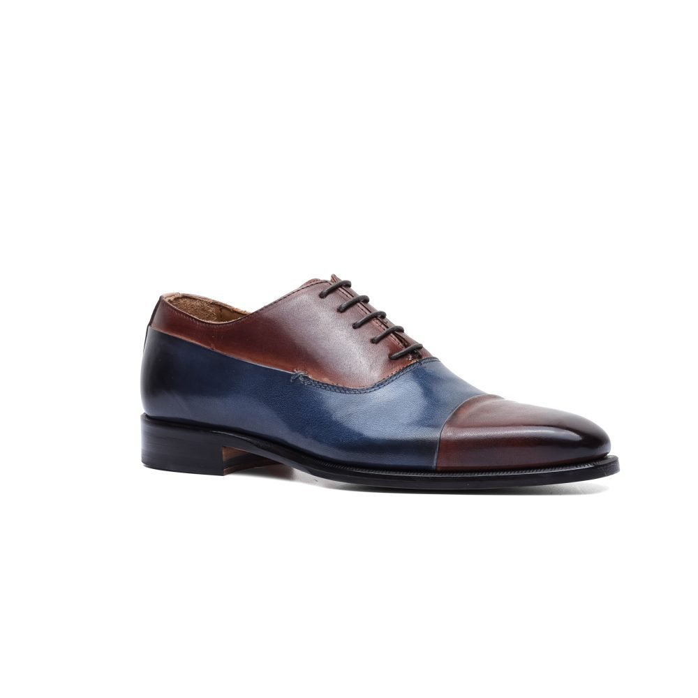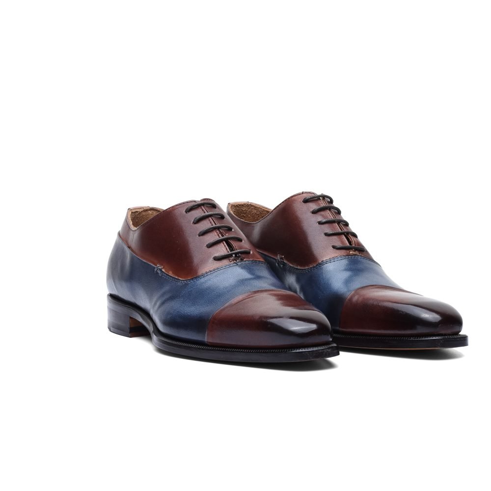 Realizzate in pelle di vitello tinta a mano nel colore blu e marrone con punta e tallone sfumati.