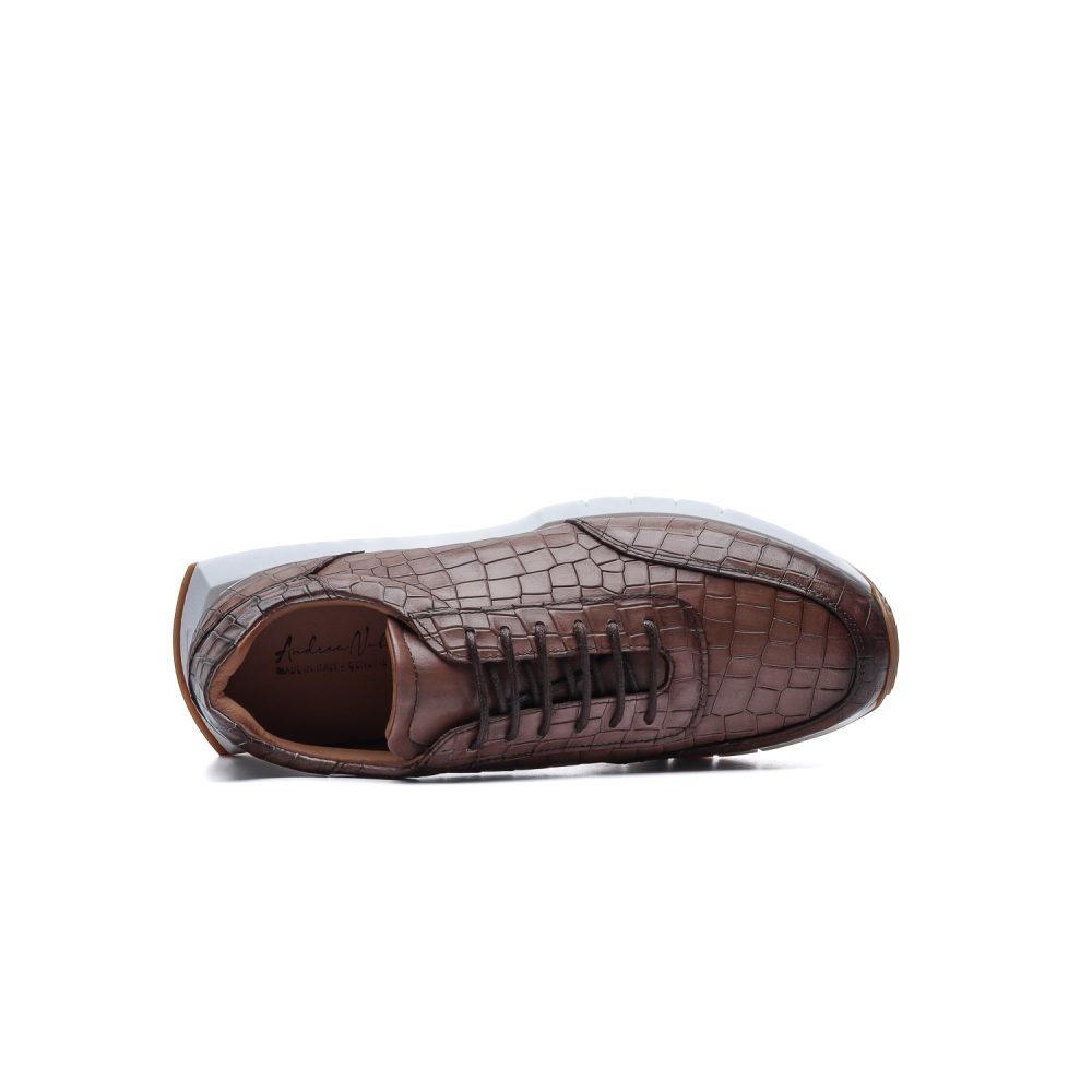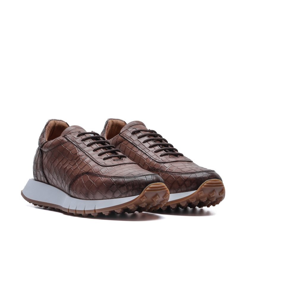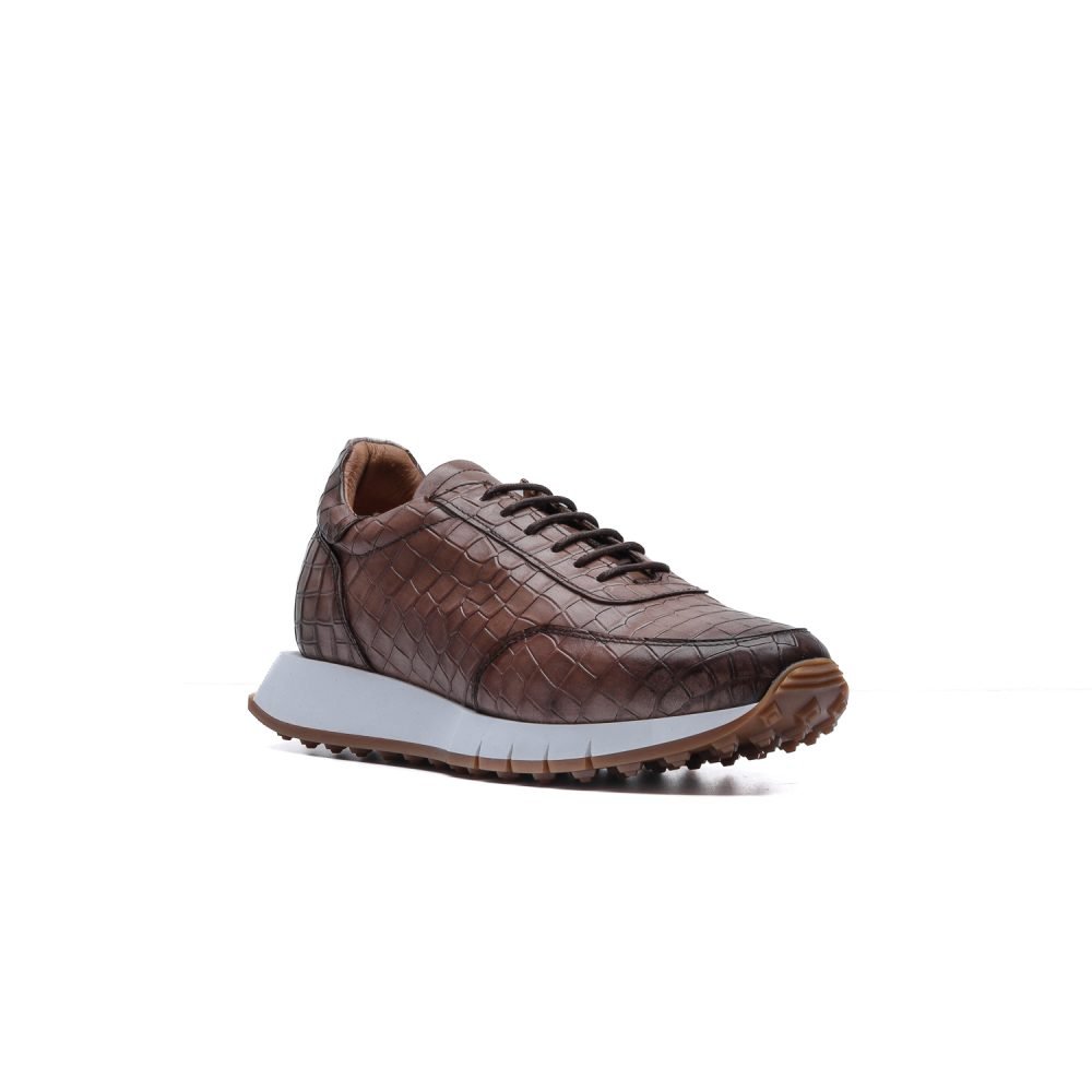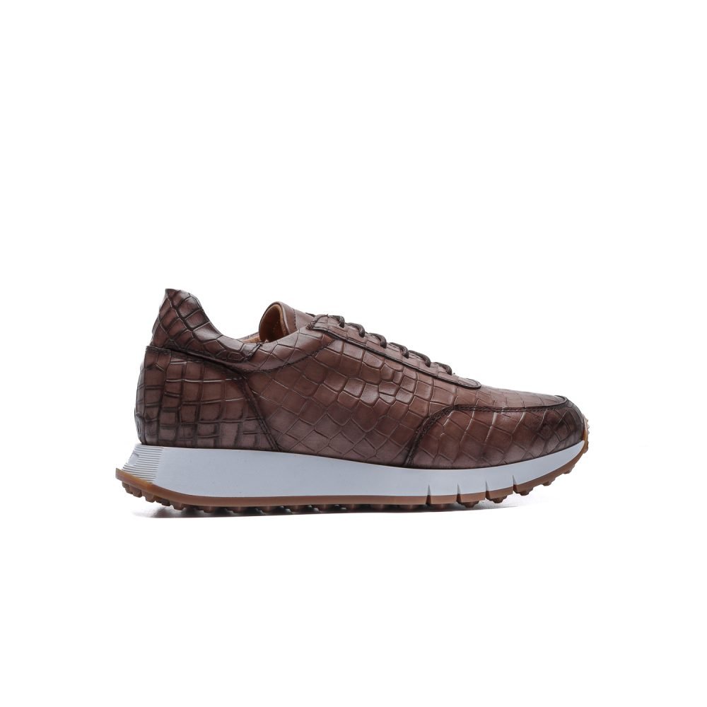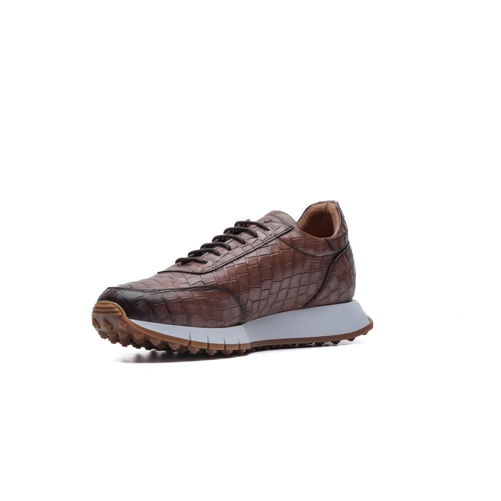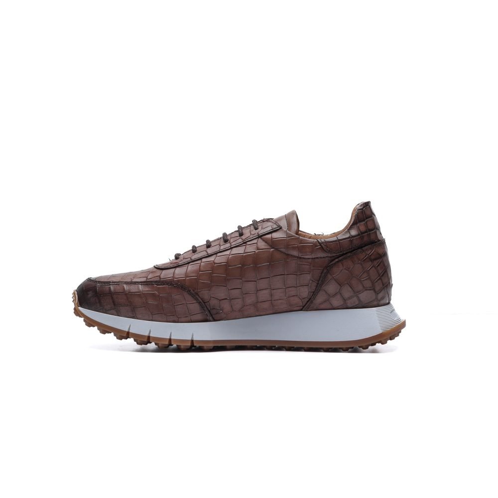 Sneaker Artigianale Made in Italy realizzata in vera pelle con stampa coccodrillo, tinta a mano nel colore taupe con sfumature naturali, dal design minimalista e raffinato.