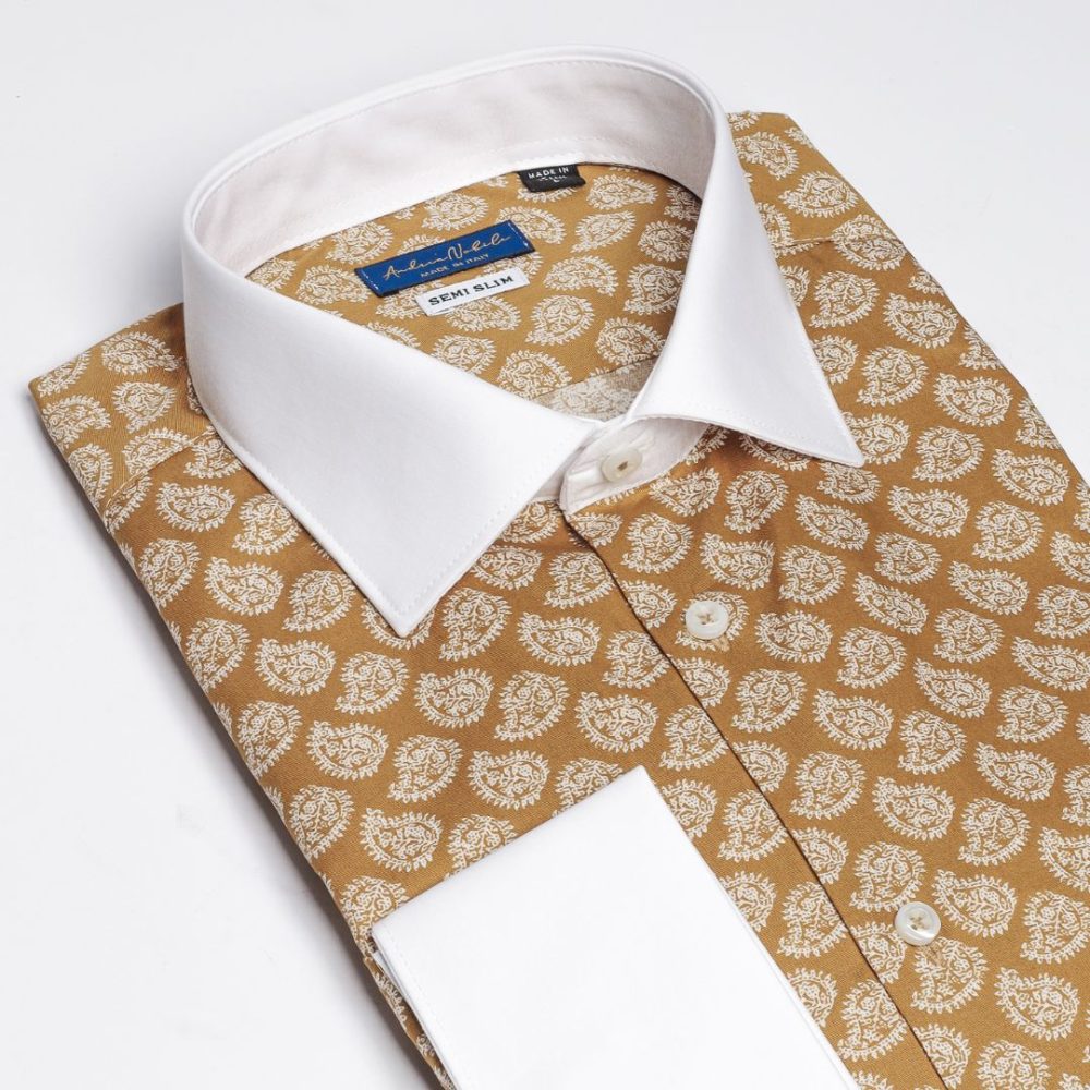 Camicia Made in Italy, resa particolare dalla fantasia tribale nel colore bianco su base giallo ocra.
