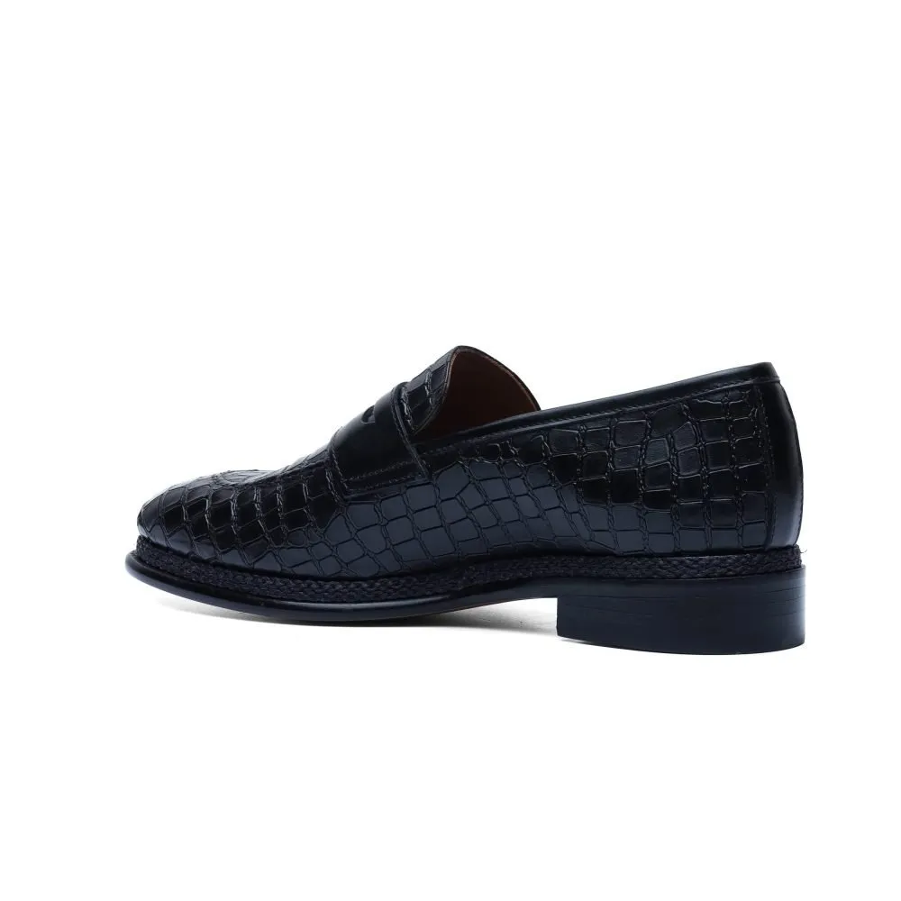 Confectionnée en cuir de veau imprimé crocodile teinté en noir, l'emblématique empeigne ton sur ton est appliquée sur le devant de la tige, là où les jeunes étudiants placeraient un centime comme porte-bonheur.