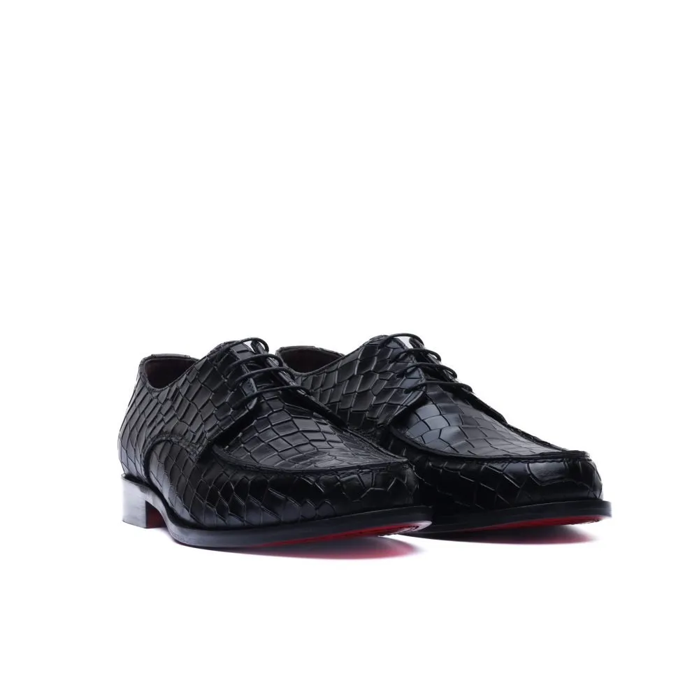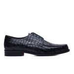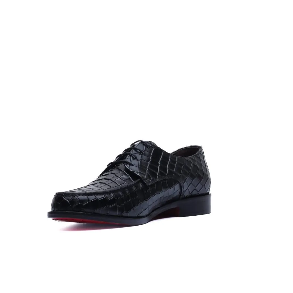 हस्तनिर्मित, इटालीमा निर्मित डर्बी जुत्ताहरू जसको माथिल्लो भागमा गोहीको छाप छ।