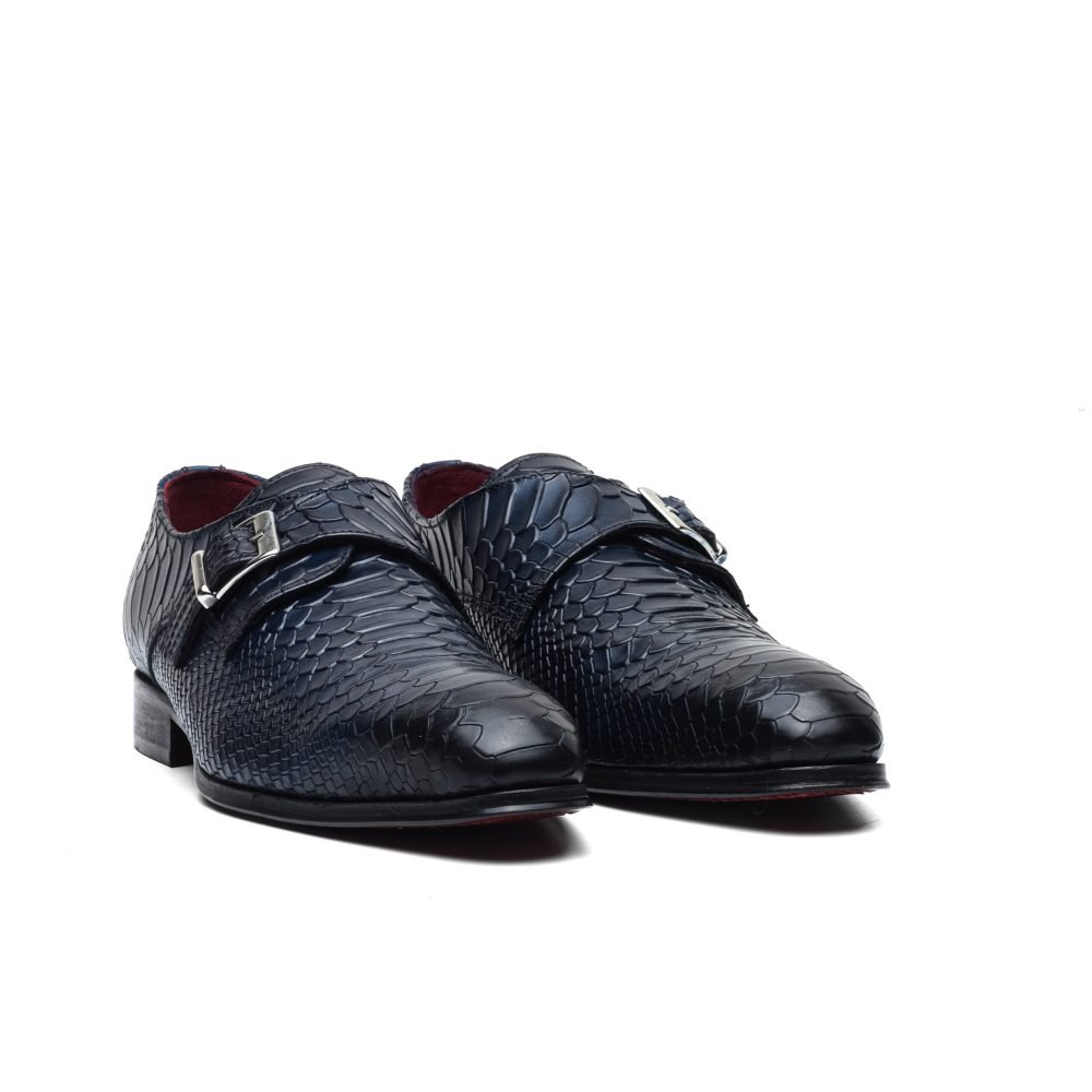 Calzature artigianali Made in Italy modello Monk Strap o anche conosciute come “mono fibbia”, caratterizzata dalla stampa effetto anaconda su tutta la tomaia.