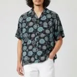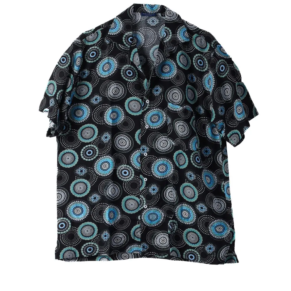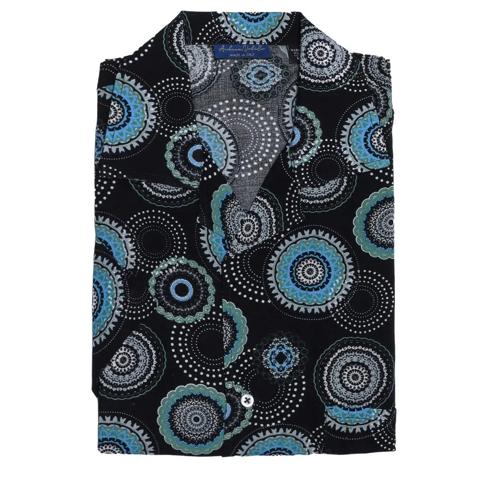 Camicia a maniche corte, leggera e traspirante, caratterizzata da una stampa circolare in tonalità fredde tra il blu oceano e il verde salvia su fondo nero profondo, questa fantasia richiama motivi mandalici e vibrazioni psichedeliche, dando al capo un’allure decisa e contemporanea. Un pattern ricco di ritmo visivo, perfetto per chi ama distinguersi con stile anche nei look estivi.