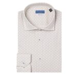 Camicia made in Italy, resa particolare dalla fantasia geometrica in varie sfumature di blu, marrone e bianco su base crema, collo alla francese con polsini con angoli squadrati.
