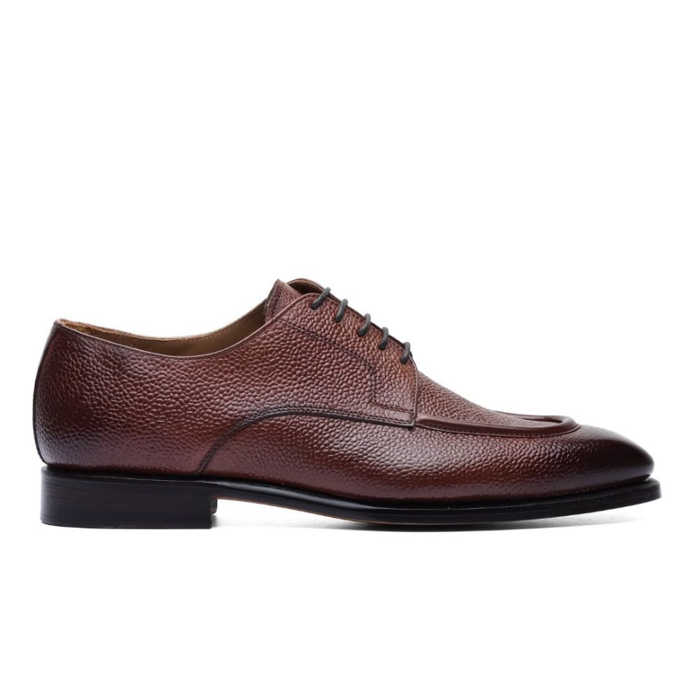 Realizzate in pelle di vitello con trama a “chicco di riso” tinta a mano nel colore marrone, con punte e talloni sfumati.