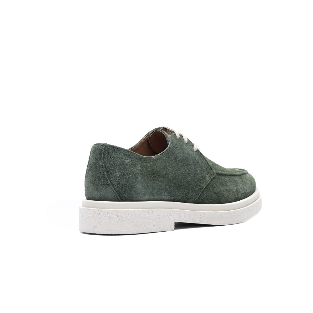 Realizzata in pelle scamosciata tinta nel colore verde oliva con lacci nel colore beige.