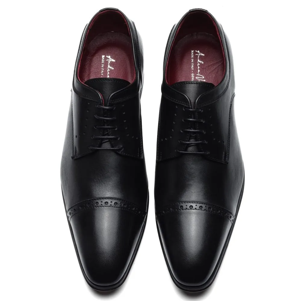 Calzature stringate artigianali Made in Italy modello Derby, rese particolari dalle micro-forature che riportano sulla parte alta della tomaia e sul puntale.
