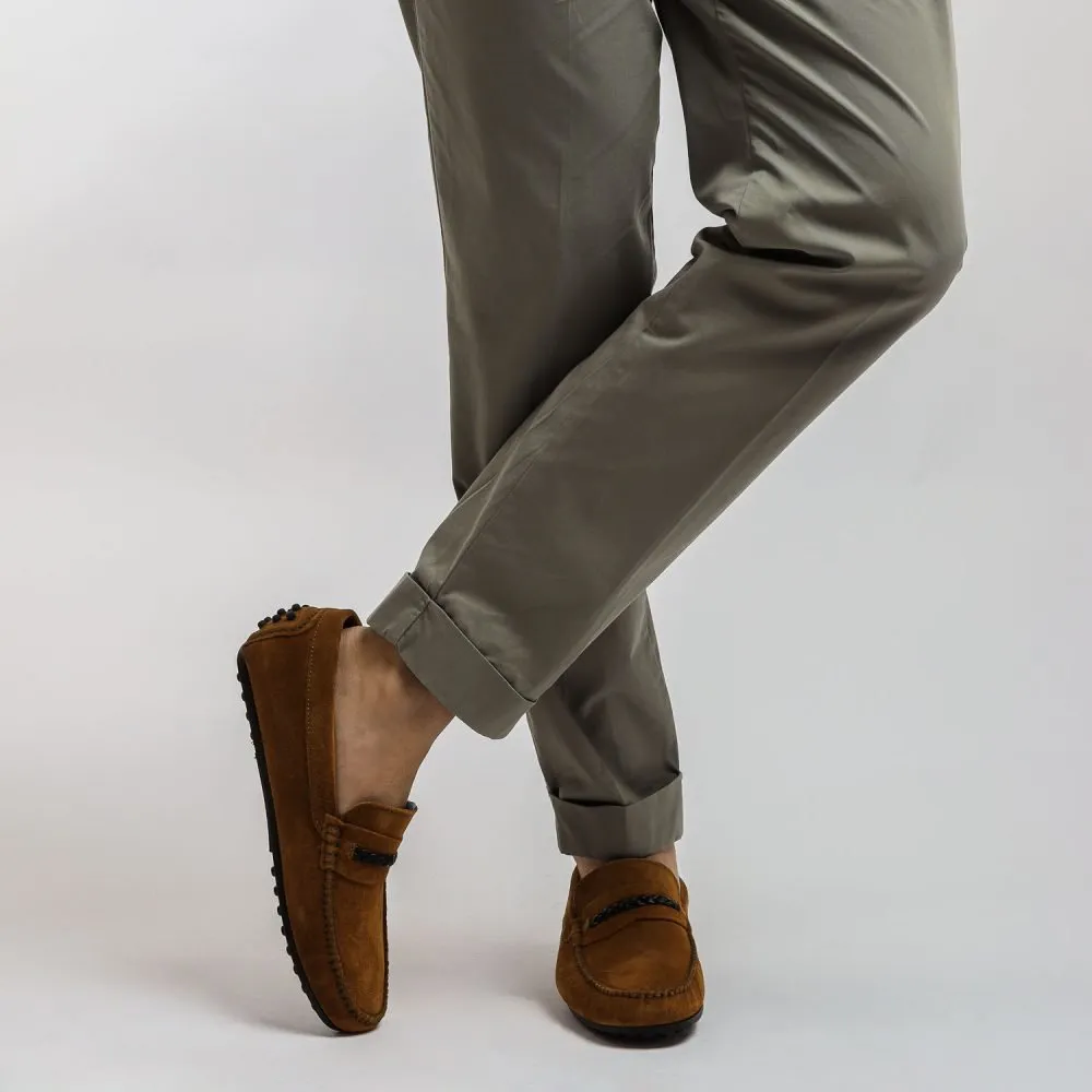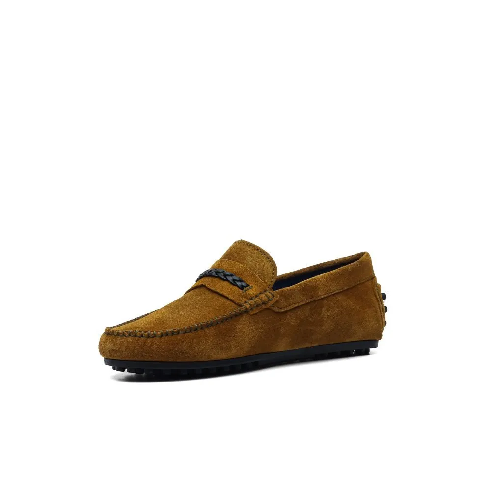 Calzature artigianali Made in Italy modello Driver Loafer, rese interessanti dal cordino intrecciato a contrasto nel colore nero sulla mascherina.