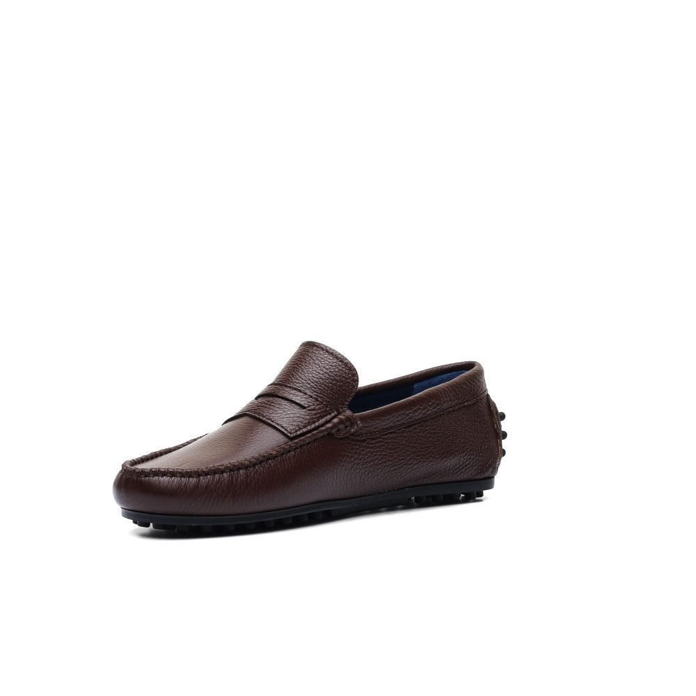 Realizzata in pelle di vitello martellata tinta a mano nel colore marrone, sulla parte frontale della tomaia è applicata l’iconica mascherina dei Penny tono su tono.