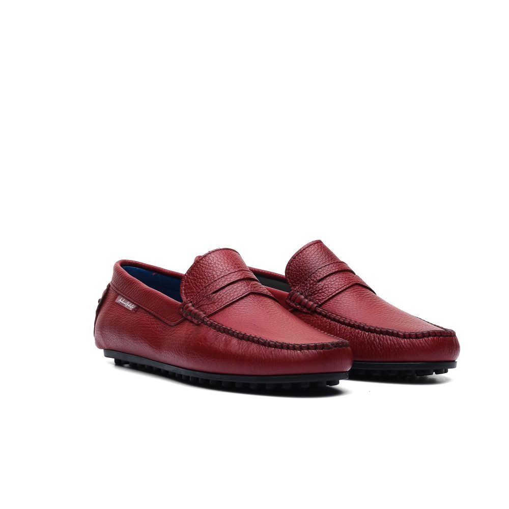 Realizzata in pelle di vitello martellata tinta a mano nel colore rosso, sulla parte frontale della tomaia è applicata l’iconica mascherina dei Penny tono su tono.
