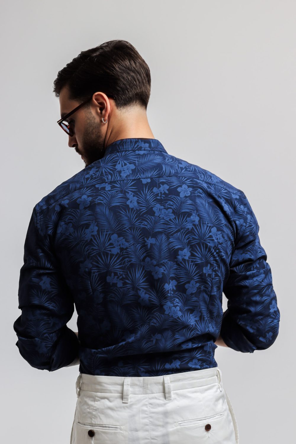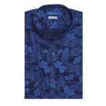 Camicia made in Italy, resa particolare dalla fantasia floreale nel colore azzurro su base blu, collo alla coreana con polsini con angoli arrotondati e due bottoni.