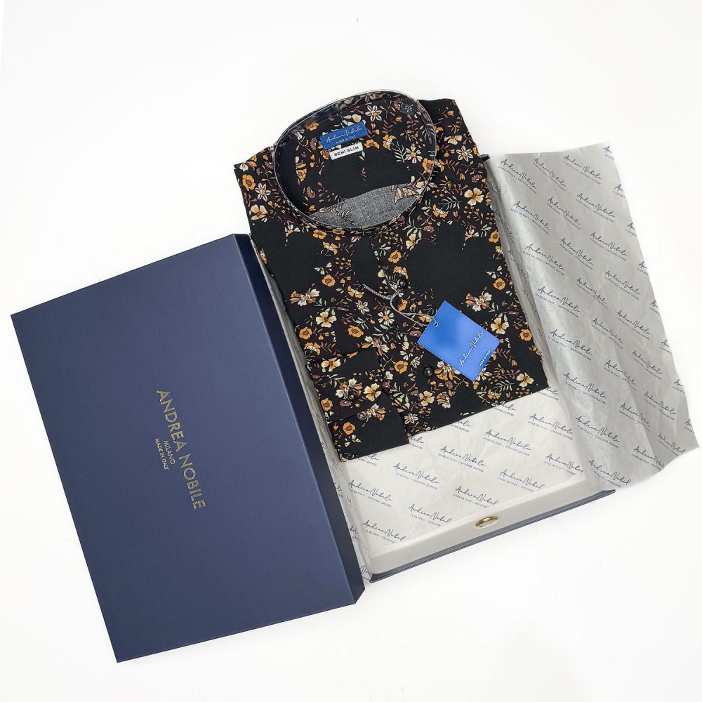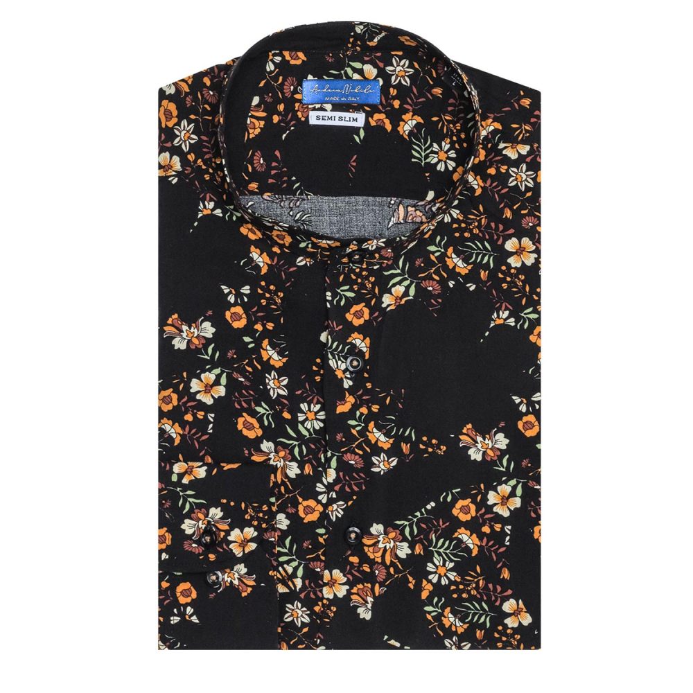 Camicia made in Italy, resa particolare dalla fantasia floreale nel colore arancio, verde e bianco su base nera, collo alla coreana con polsini con angoli arrotondati e due bottoni.
