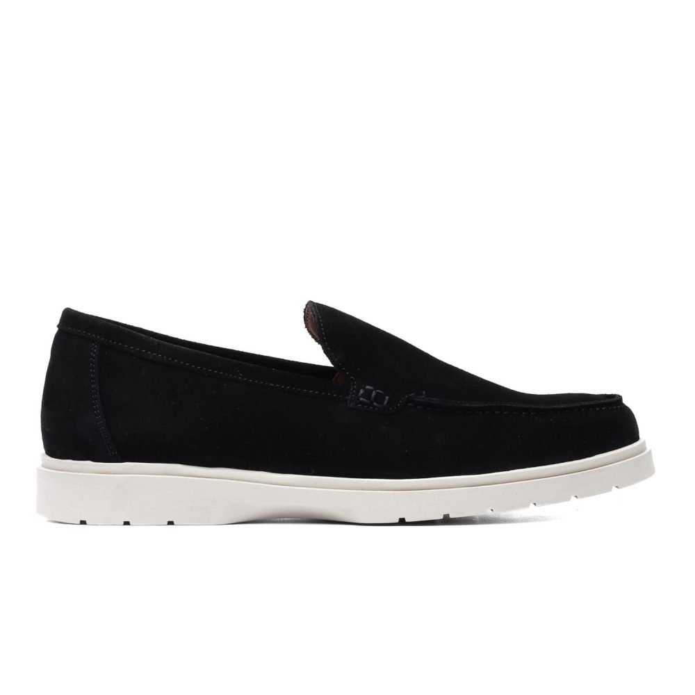 Calzatura artigianale made in Italy modello Loafer. Realizzata in pelle scamosciata tinta nel colore nero. Interno foderato in pelle nel colore beige con logo stampato nel colore nero. Suola in gomma ultra-leggera, nel colore bianco naturale, per offrire maggior comfort alle lunghe passeggiate. Un classico dalla struttura innovativa, indossale con dei pantaloni sartoriali o chinos slim fit.