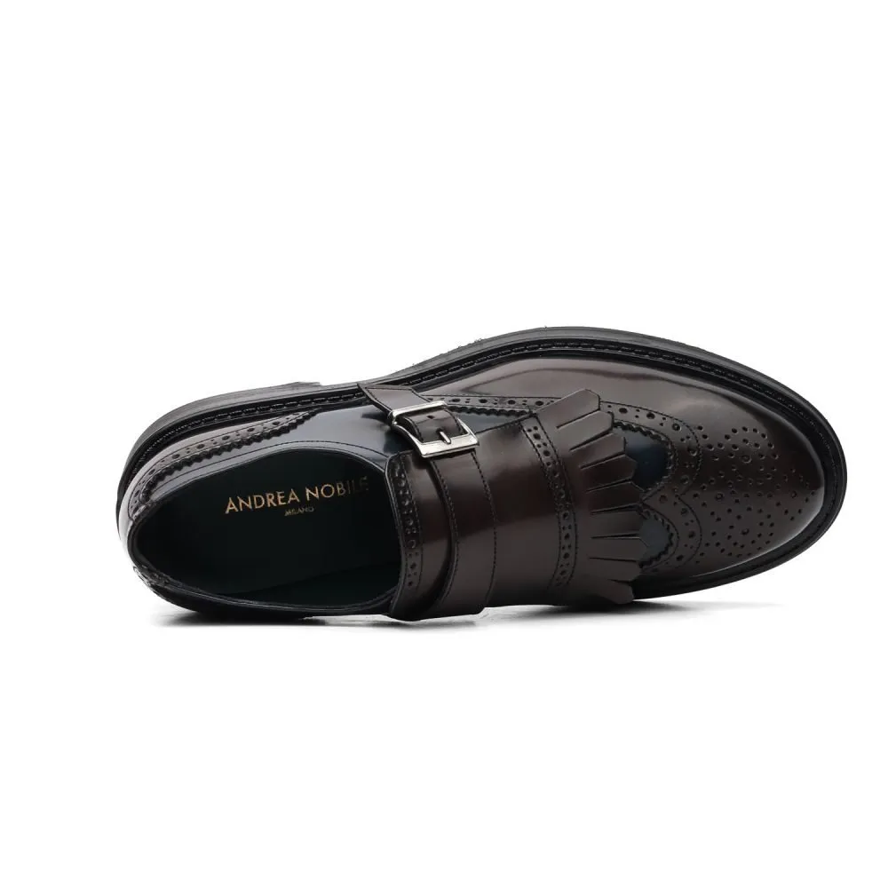 Spazzolata effetto specchioCalzatura artigianale Made in Italy modello Monk Strap o anche conosciuta come “Mono Fibbia”, caratterizzata dall’applicazione della mascherina con frange che unisce il cinturino regolabile con fibbia metallica.