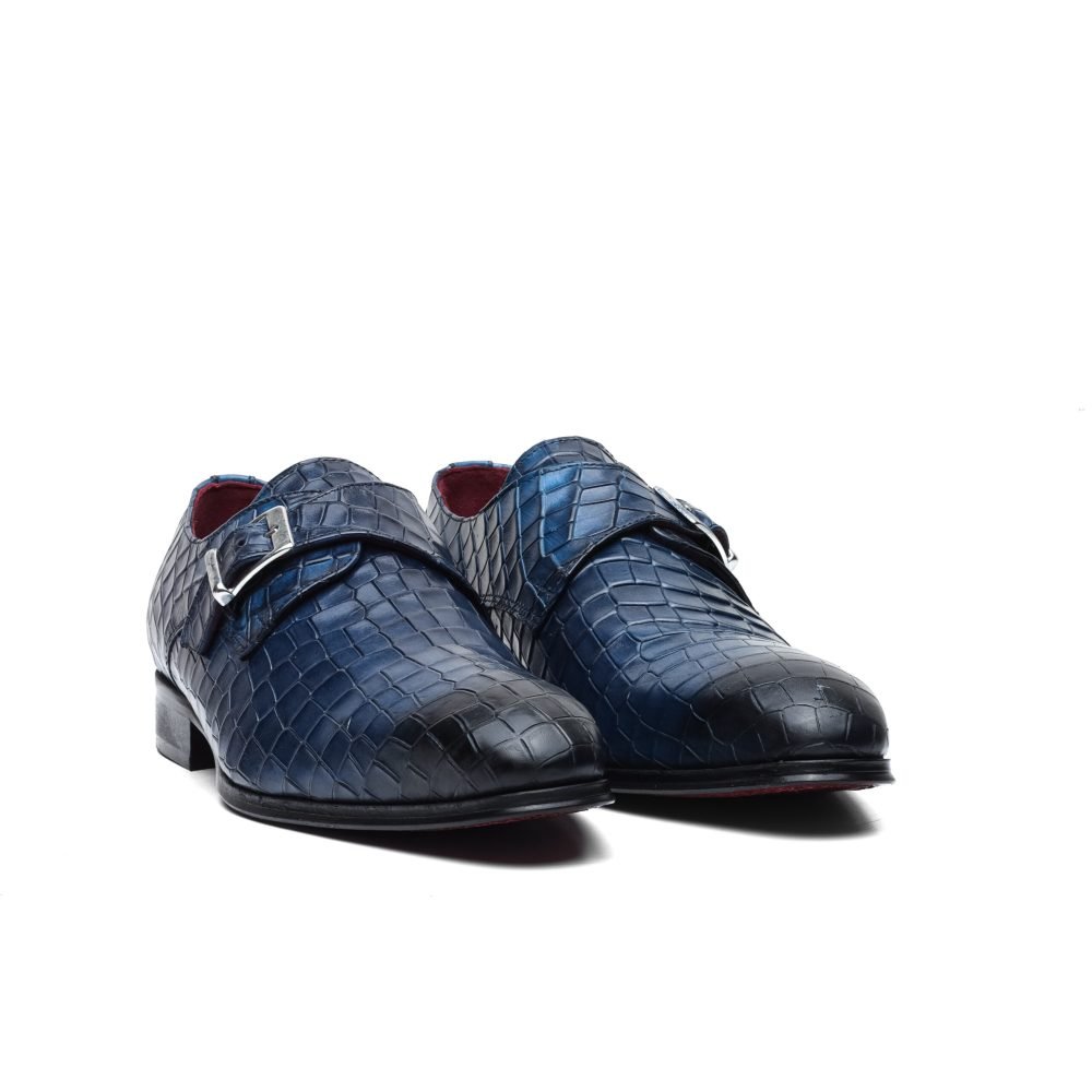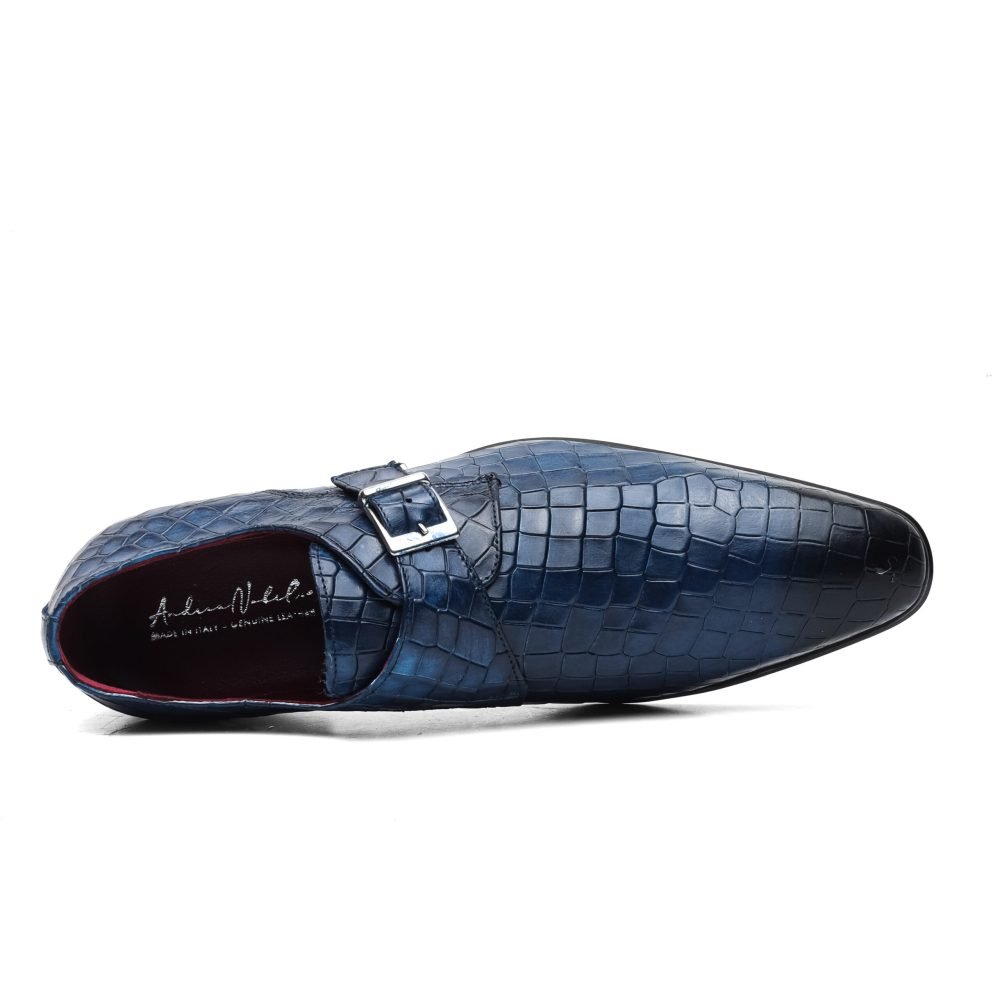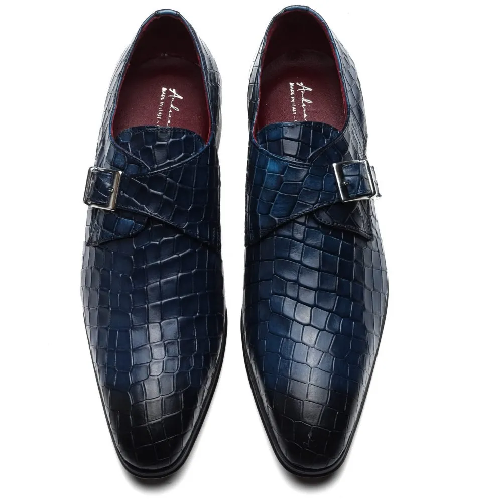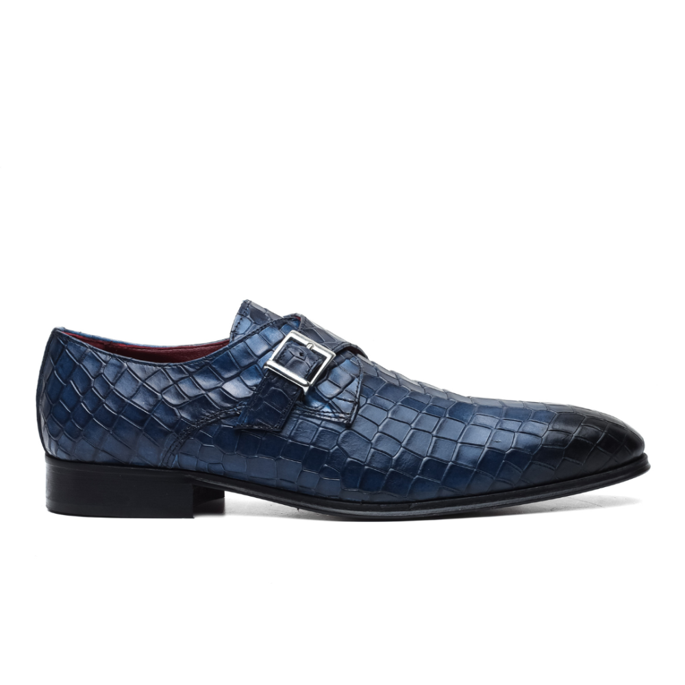 Calzature artigianali Made in Italy modello Monk Strap o anche conosciute come “mono fibbia”, caratterizzata dalla stampa effetto coccodrillo su tutta la tomaia.