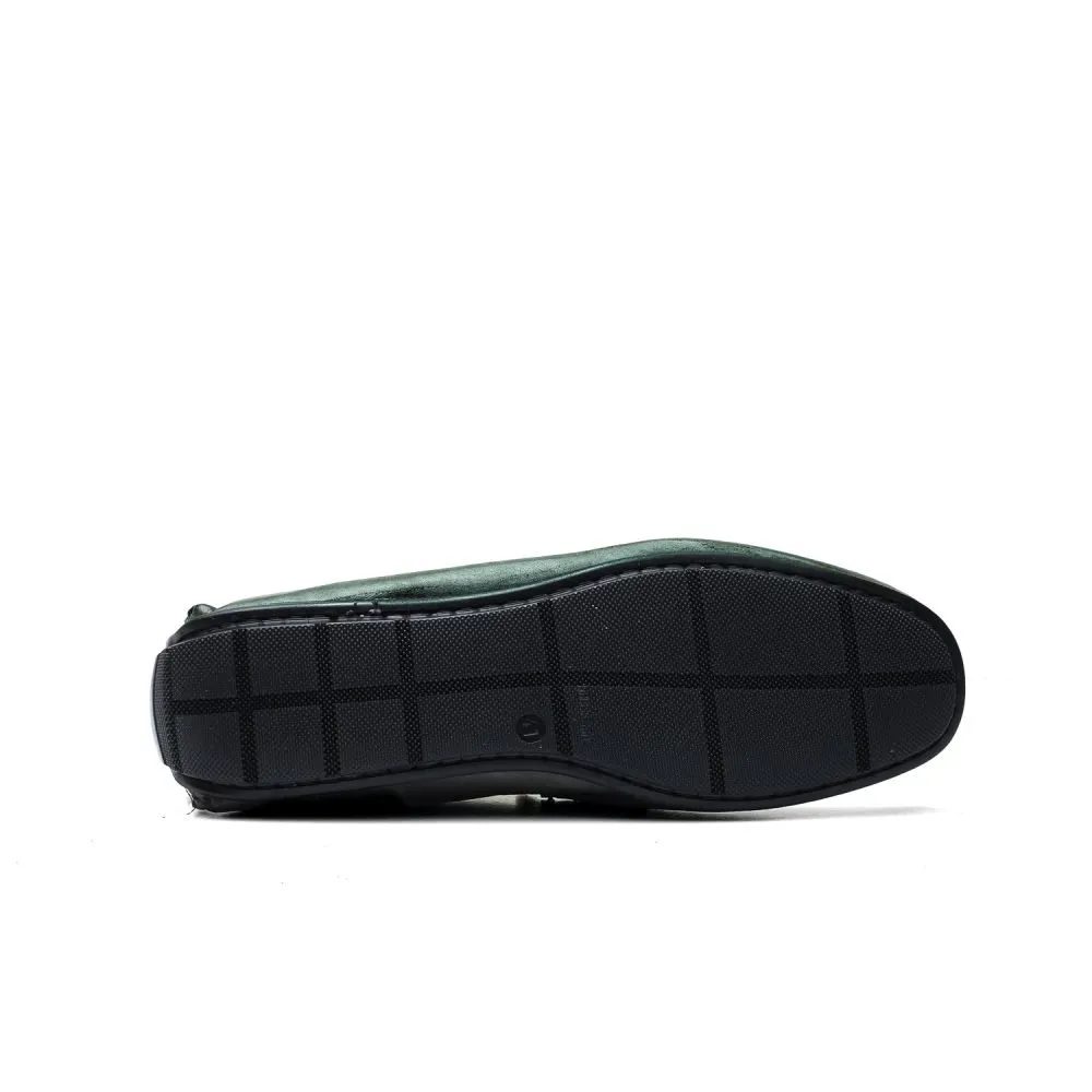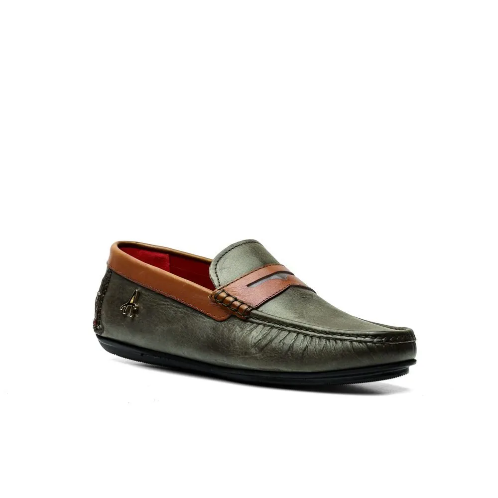 Realizzate in pelle di vitello tinta a mano nel colore verde con mascherina a contrasto nel colore cuoio.