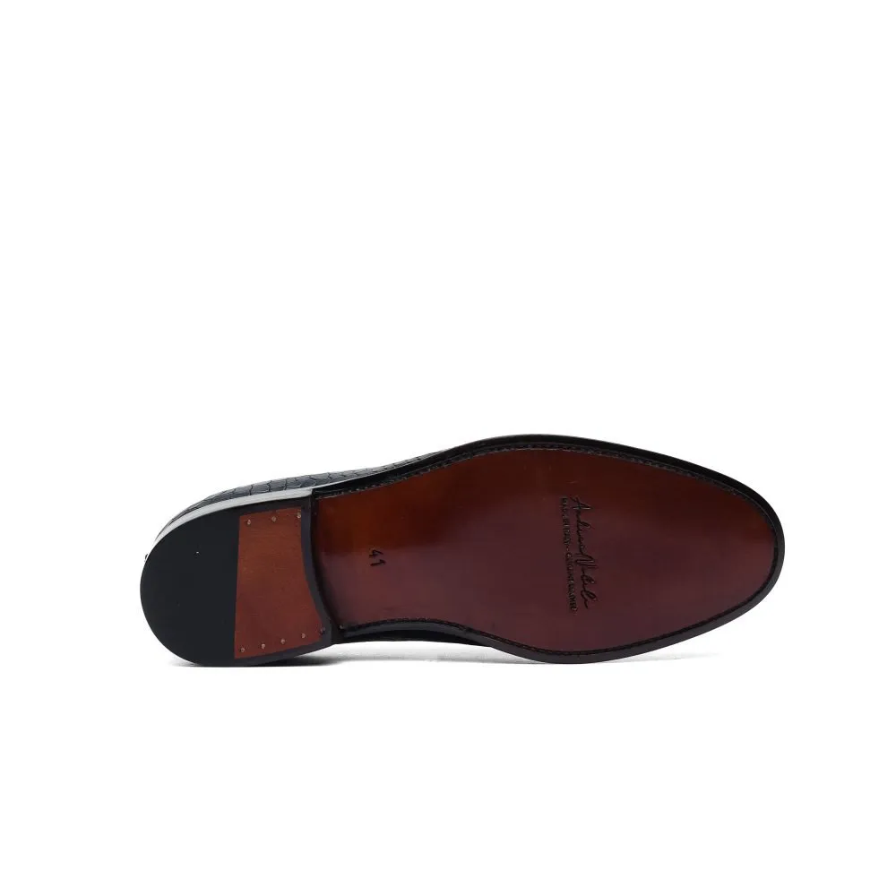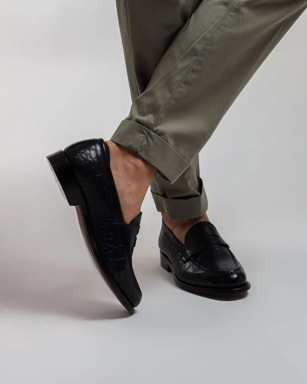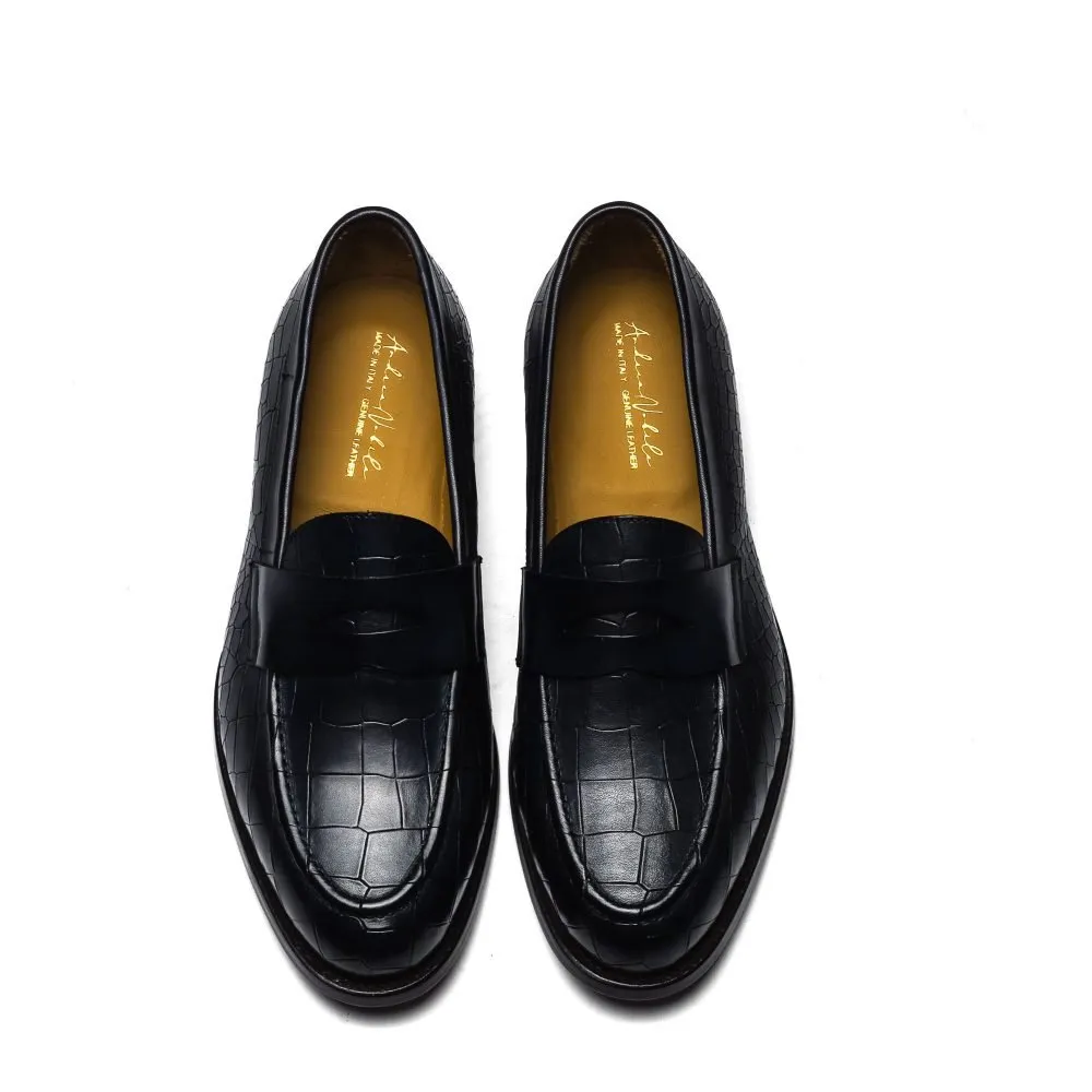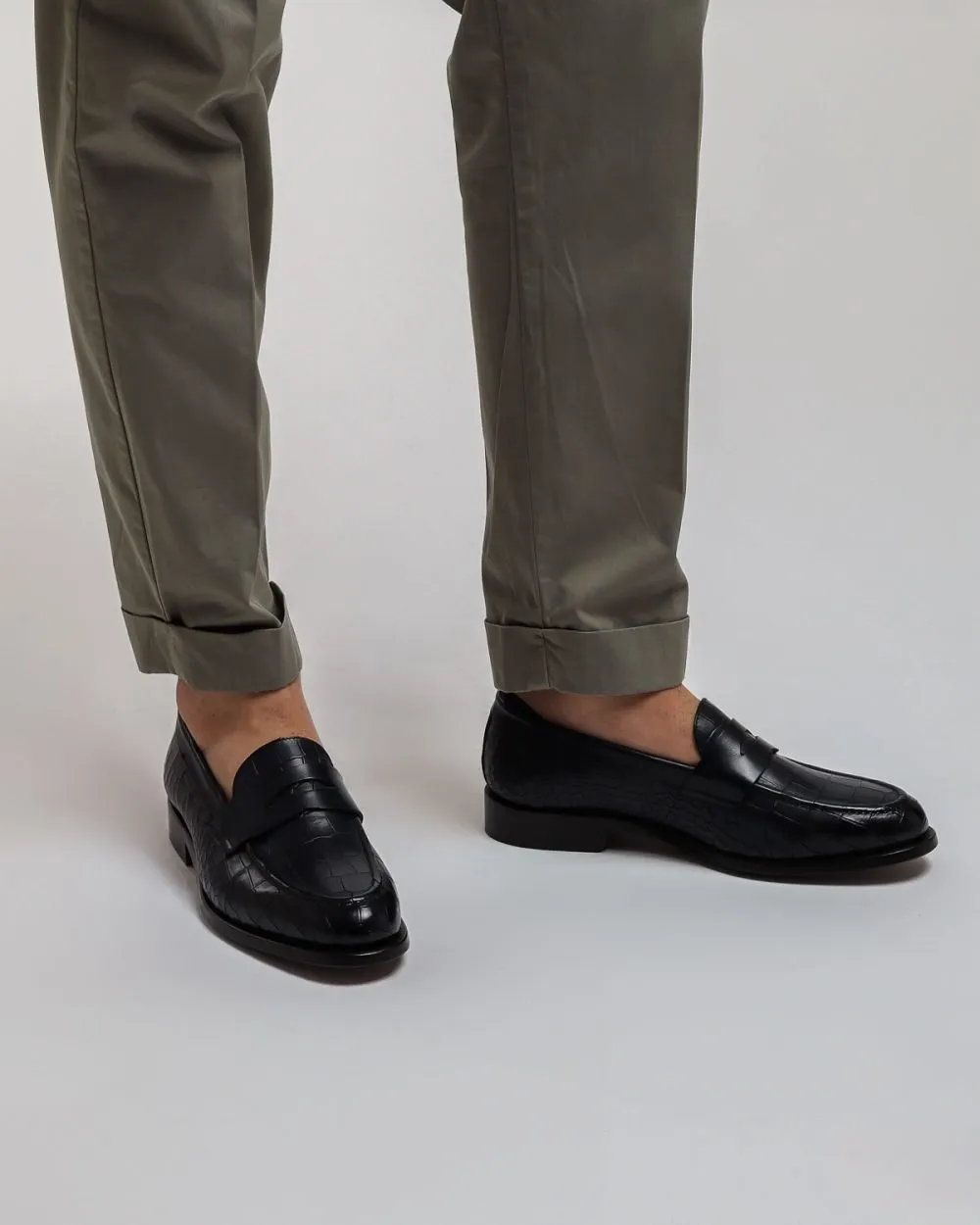 Stampa CoccodrilloCalzature artigianali Made in Italy modello Penny Loafer o più comunemente conosciute come “Mocassini Penny”, caratterizzate dalla stampa coccodrillo su tutta la tomaia.