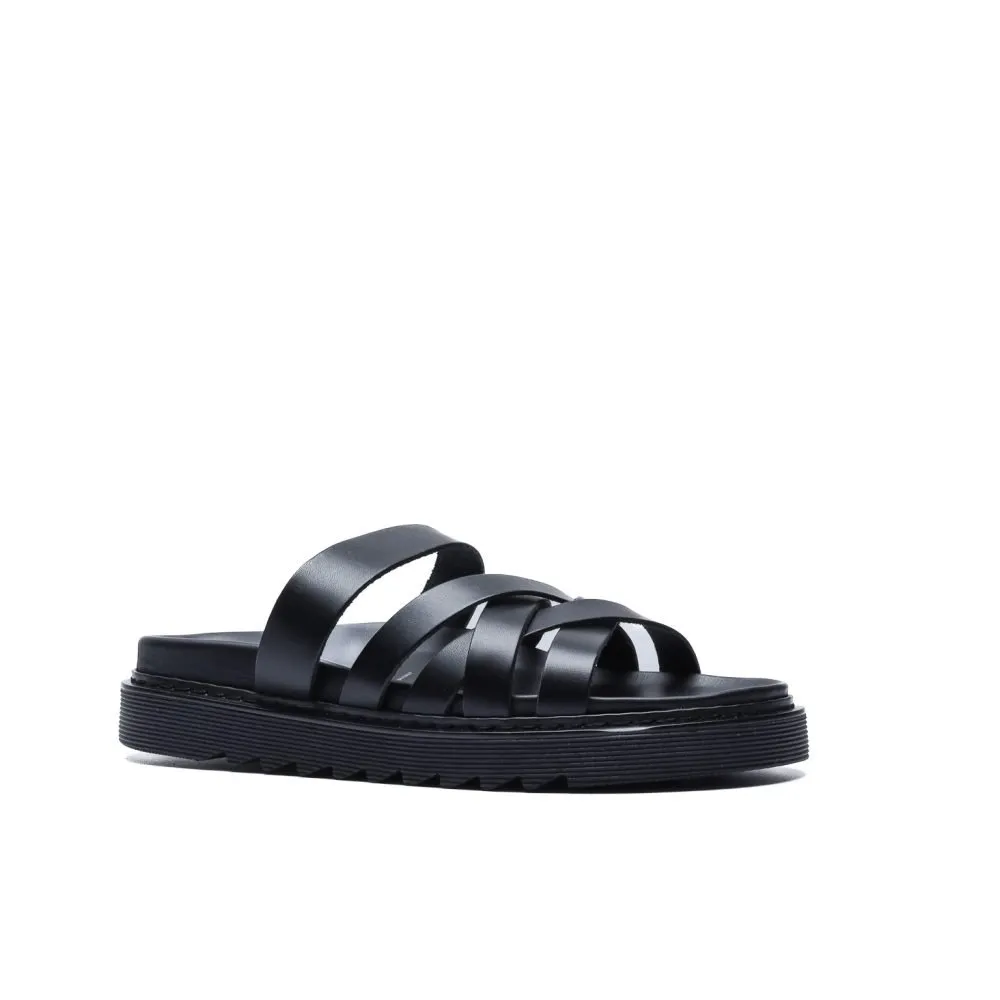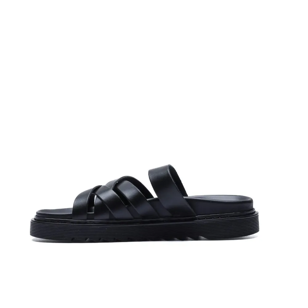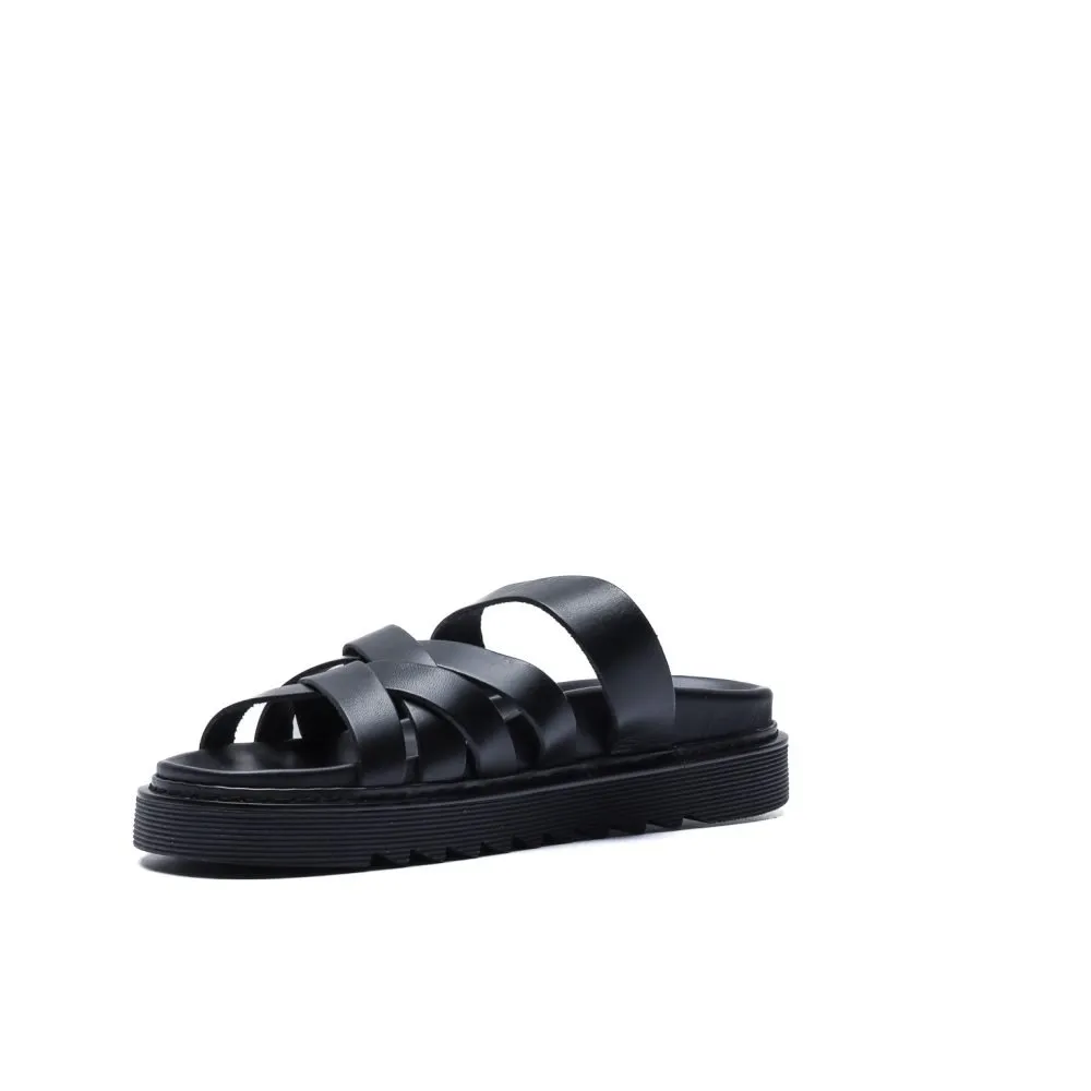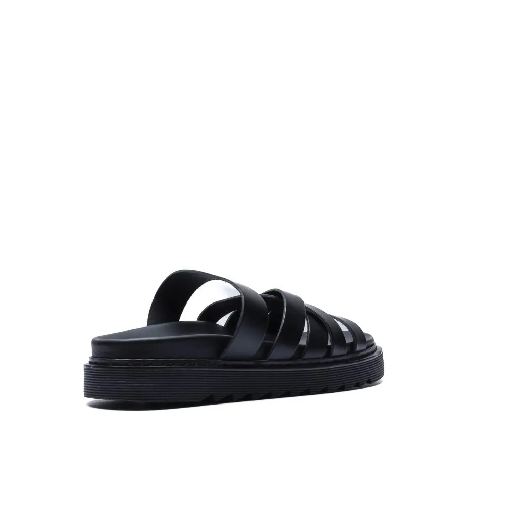 Realizzata in morbida vacchetta nera con finitura opaca, questa slider presenta una costruzione a fasce intrecciate che abbracciano il piede con struttura e leggerezza.