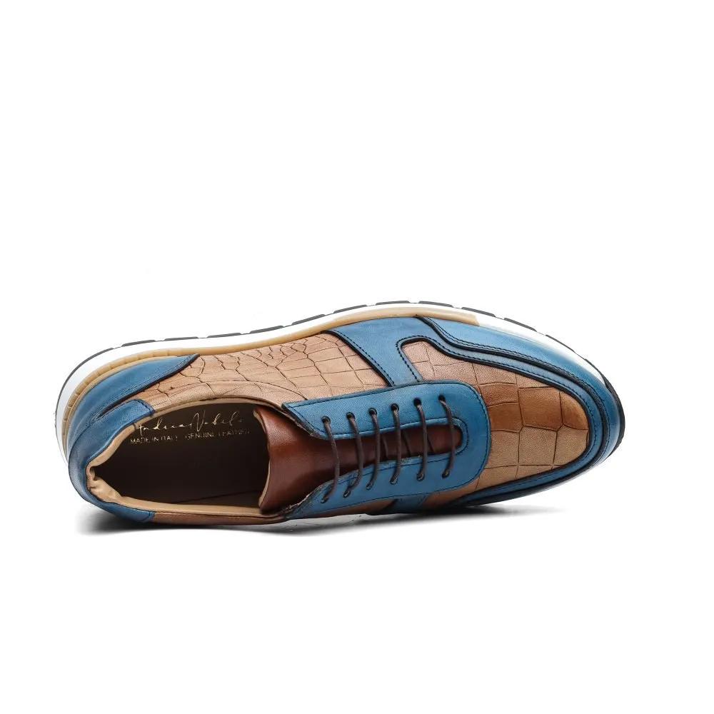 Sneakers In Pelle Blu Jeans e Marrone Con Stampa Coccodrillo