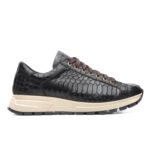 Realizzata in morbida pelle di vitello con stampa coccodrillo, tinta a mano nel colore nero, lacci a contrasto nel colore grigio con profili bordeaux e linguetta con salpa in tinta e iniziali del logo inciso.