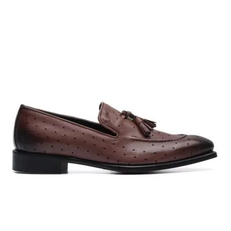 Calzature artigianali Made in Italy modello Tassel Loafer, conosciute anche come “Mocassino con Nappine”, rese particolari dalle forature applicate lungo tutta la tomaia, evidenziandone l’artigianalità.