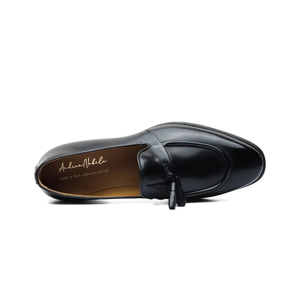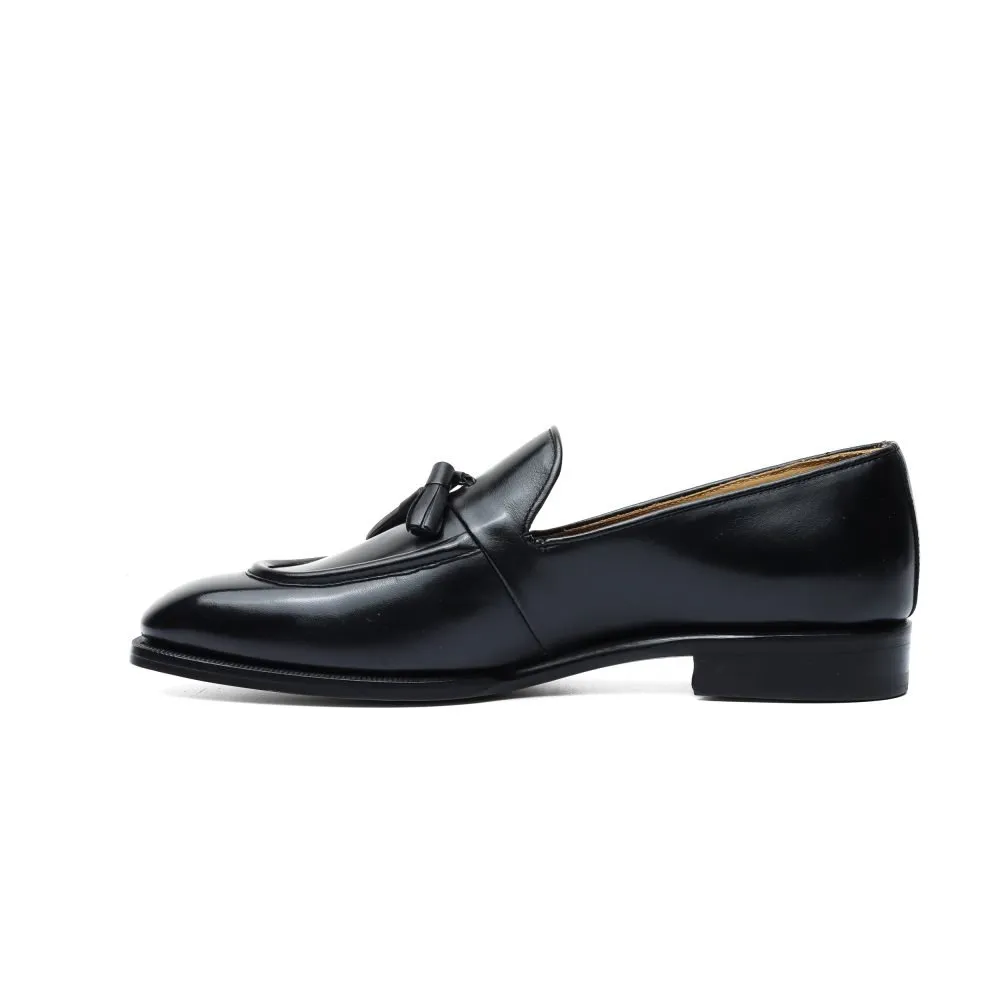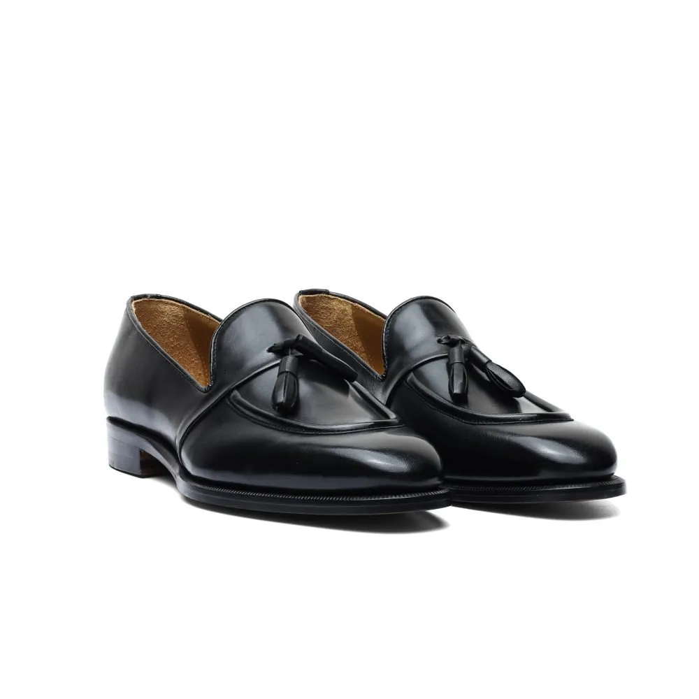 Spazzolata effetto specchioCalzature artigianali Made in Italy modello Tassel Loafer, conosciute anche come “Mocassino con Nappine”, rese particolari dalle cuciture in rilievo sulla parte superiore della tomaia, evidenziando l’artigianalità.