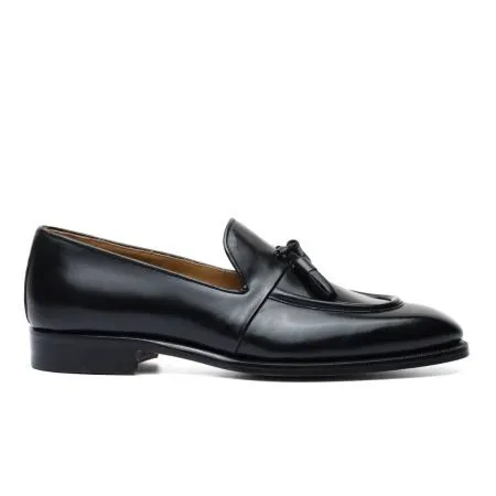 Spazzolata effetto specchioCalzature artigianali Made in Italy modello Tassel Loafer, conosciute anche come “Mocassino con Nappine”, rese particolari dalle cuciture in rilievo sulla parte superiore della tomaia, evidenziando l’artigianalità.