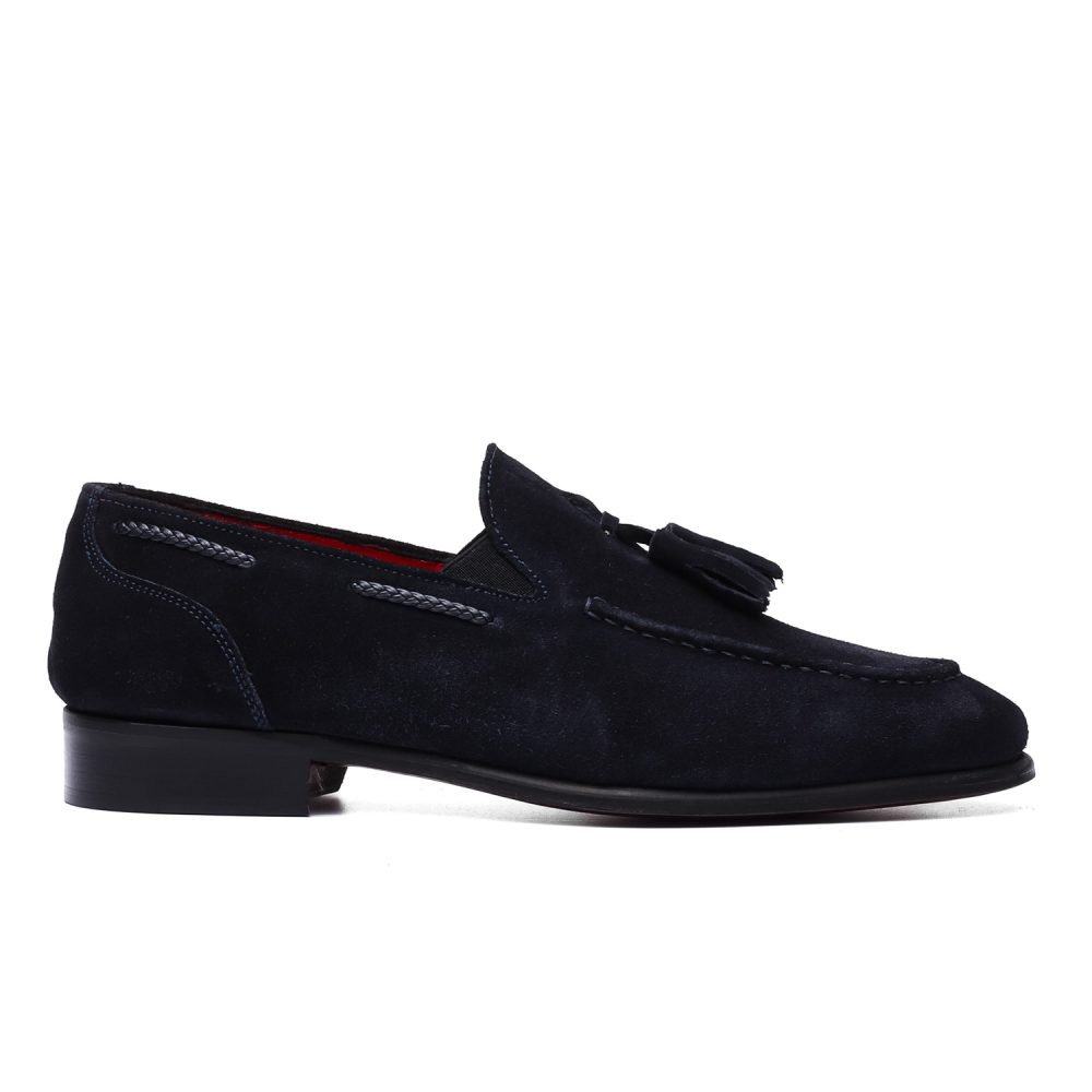 Realizzata in pelle di vitello scamosciata tinta nel colore blu, sulla mascherina della tomaia sono applicate due nappine in tinta e un’intreccio di pelle che cammina lungo i lati della parte alta della scarpa che la rendono una calzatura leggermente più informale, interno foderato in pelle beige con applicazione del logo nel colore oro.