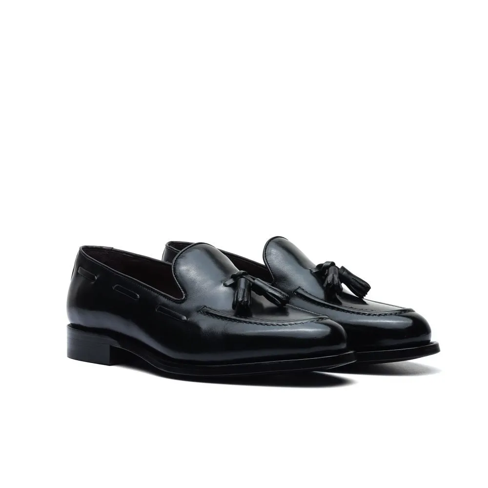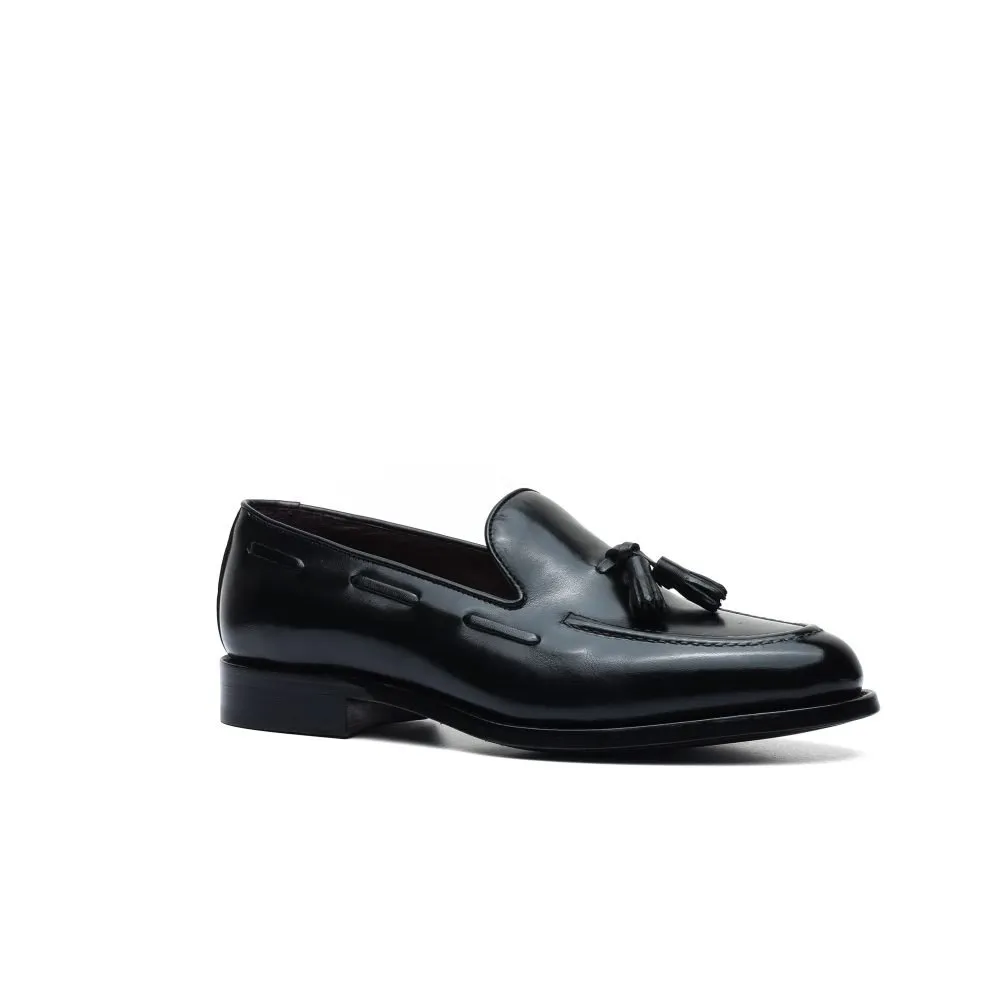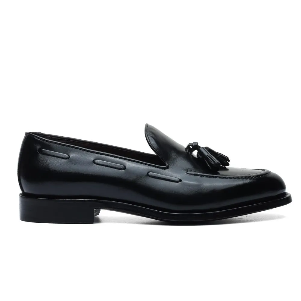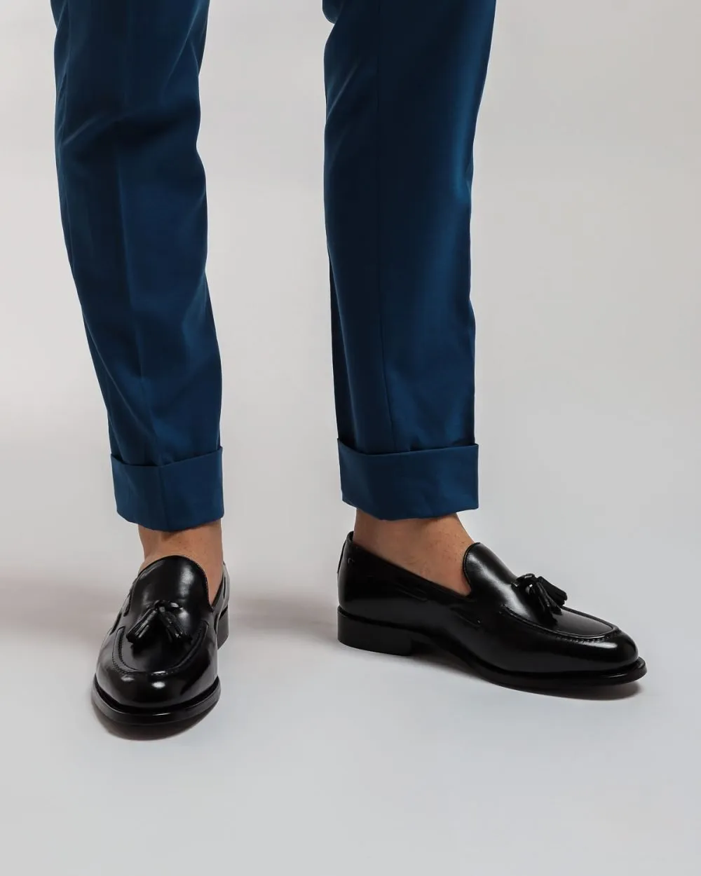 Calzature artigianali Made in Italy modello Tassel Loafer, conosciute anche come “Mocassino con Nappine”, rese particolari dalle cuciture in rilievo sulla parte superiore della tomaia, evidenziando l’artigianalità.