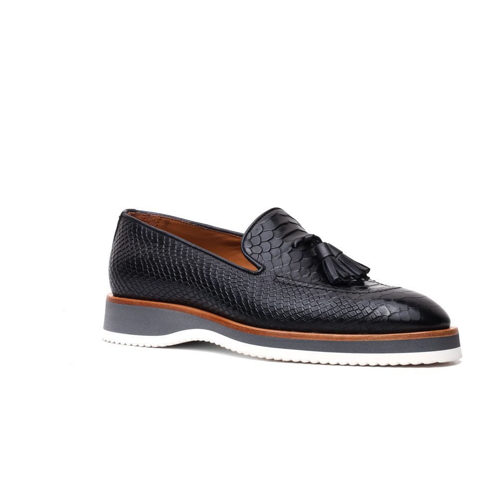Stampa CoccodrilloCalzatura artigianale made in Italy modello Tassel Loafer o più comunemente chiamata ”Mocassino con nappine”.