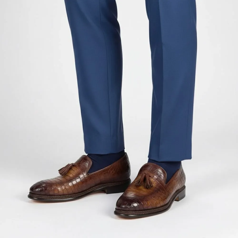 Stampa CoccodrilloCalzatura artigianale Made in Italy modello Tassel Loafer o più comunemente conosciuta come “Mocassino con Nappine” dal design senza tempo.